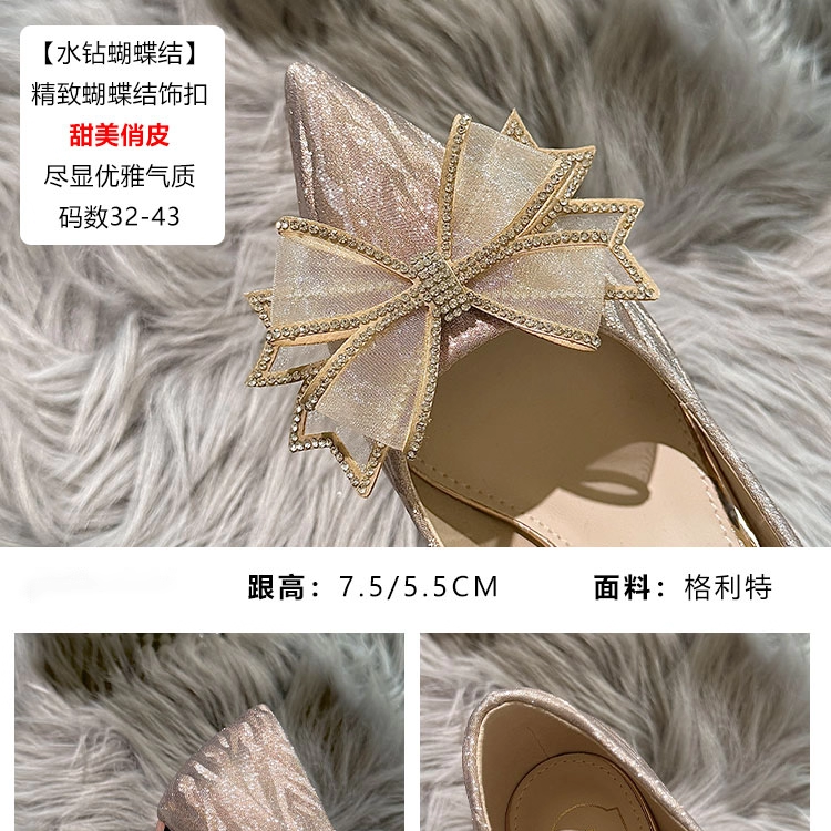 香槟色蝴蝶结高跟鞋女粗跟婚鞋尖头日常可穿不累脚新娘鞋法式单鞋