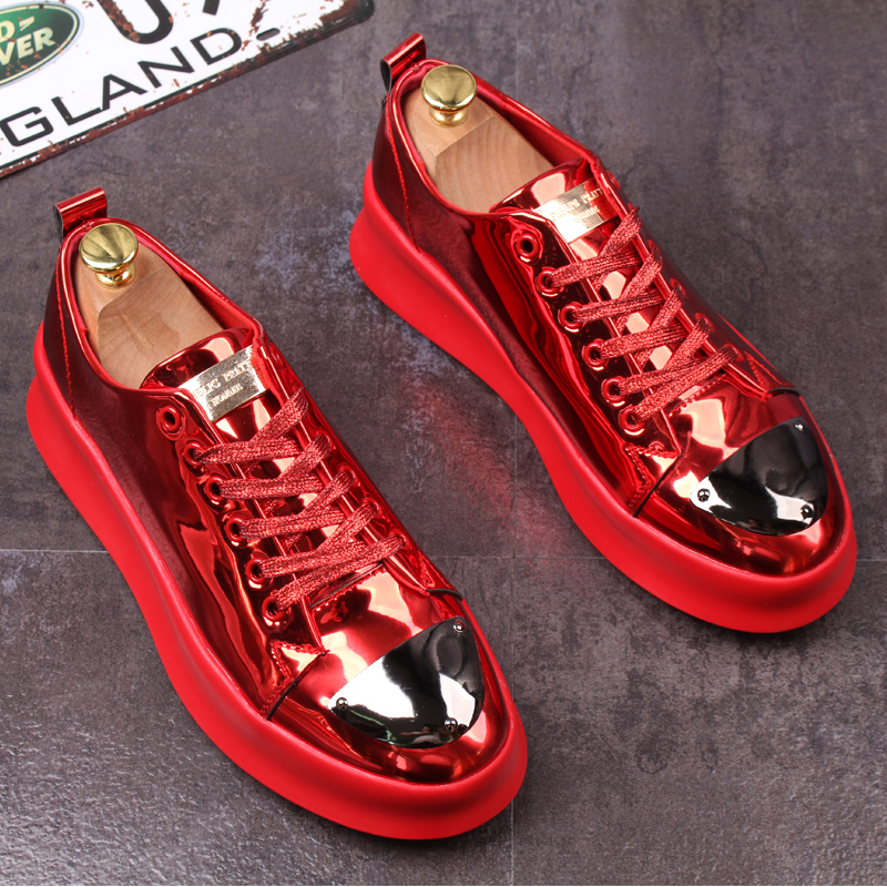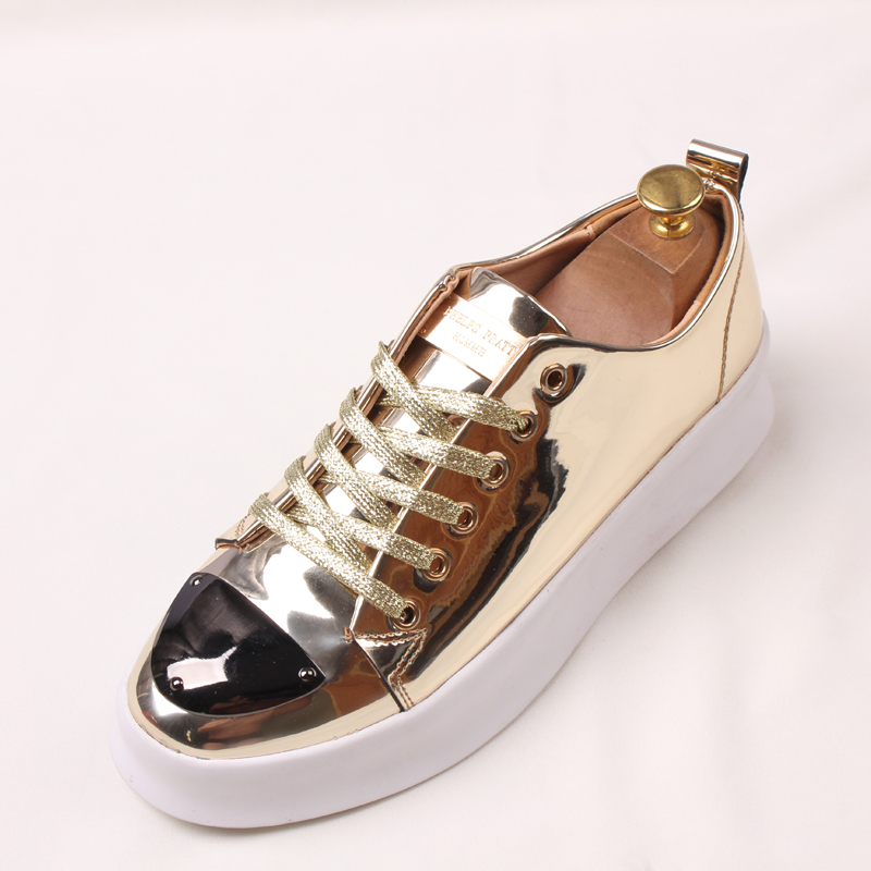 春季韩版潮流男系带透气休闲鞋漆皮金色厚底板鞋内增高低帮男鞋