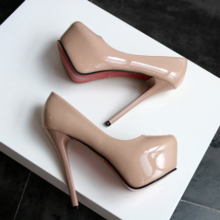 裸色漆皮红底超高跟单鞋女浅口春季防水台细跟简单亮皮恨天高14cm