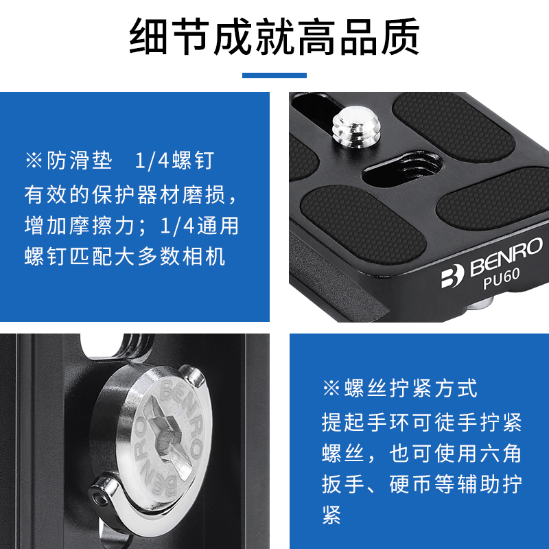 百诺PU30/50/60/70/100/120/150单反相机三角架相机云台长焦镜头单反专业快装板铝合金带防滑垫阿卡标准