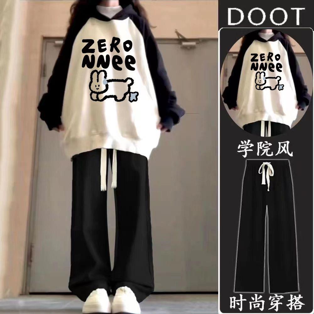 学院风秋冬季套装女2023新款少女初中生宽松连帽卫衣阔腿裤两件套
