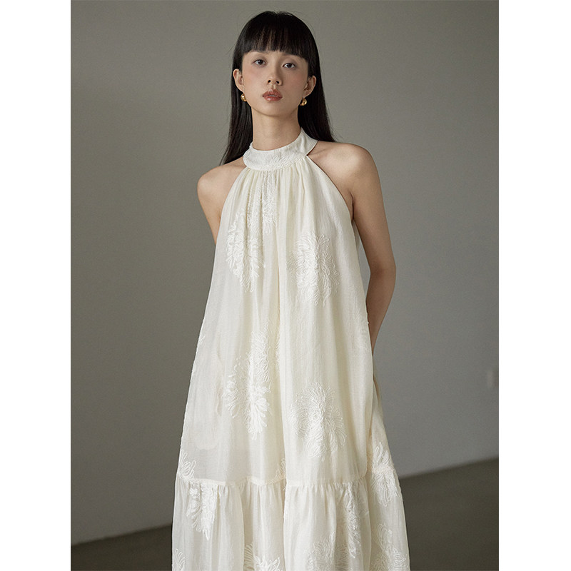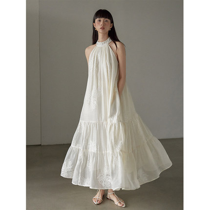 签儿2025春秋新款法式复古杏色刺绣挂脖连衣裙露肩大摆度假风长裙