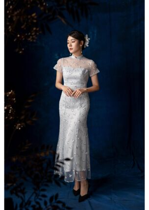 琳予纳23年夏季短袖新款新中式网纱刺绣立领复古收腰礼服连衣裙