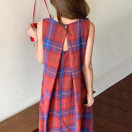 良良家设计感后背镂空格子背心连衣裙女夏季新款复古宽松棉麻长裙