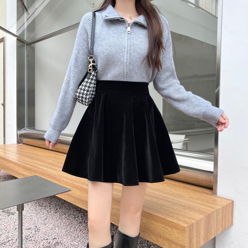 秋冬新款丝绒百褶裙半身裙韩版大码高腰显瘦伞裙胖mm遮胯蓬蓬短裙
