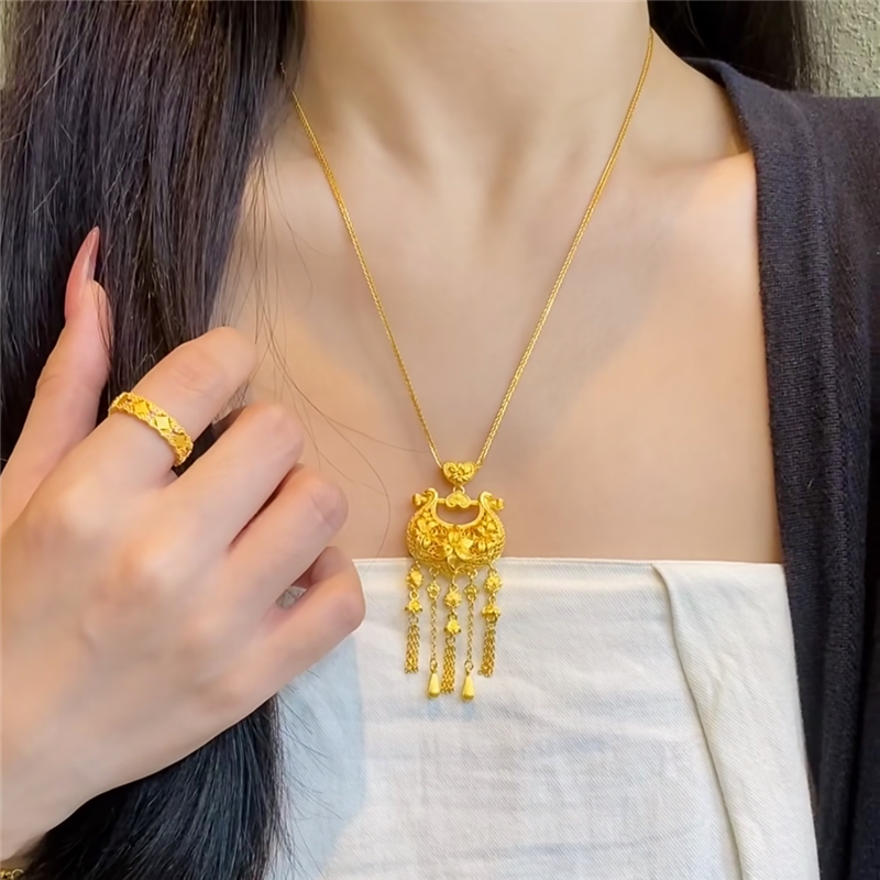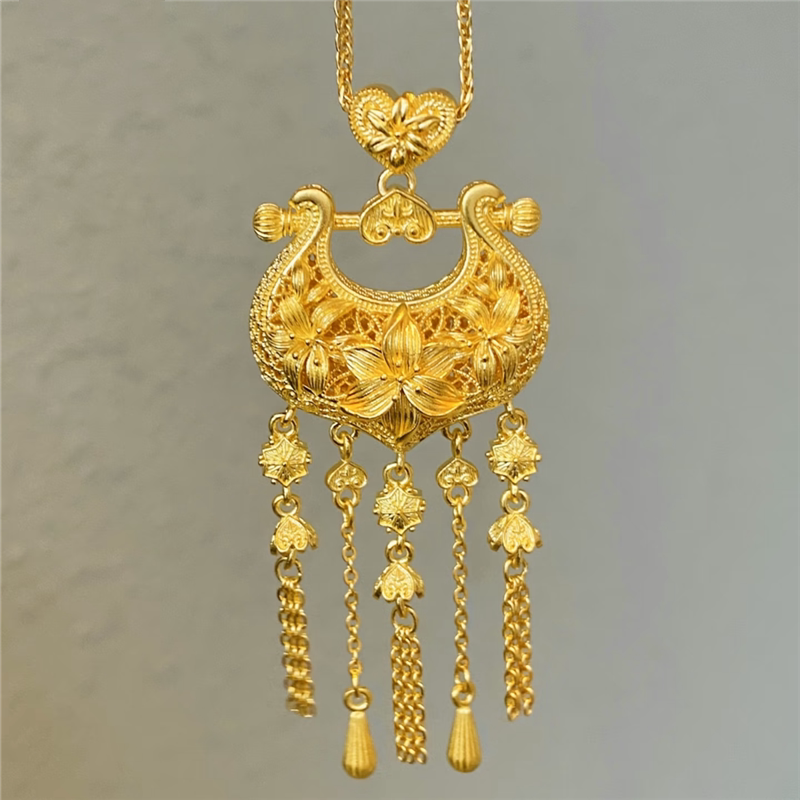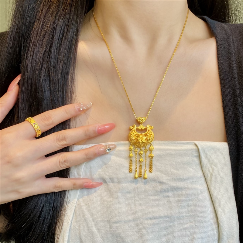 中式錾刻立体百合花如意锁项链女黄金色贵气感流苏樱珞锁包毛衣链