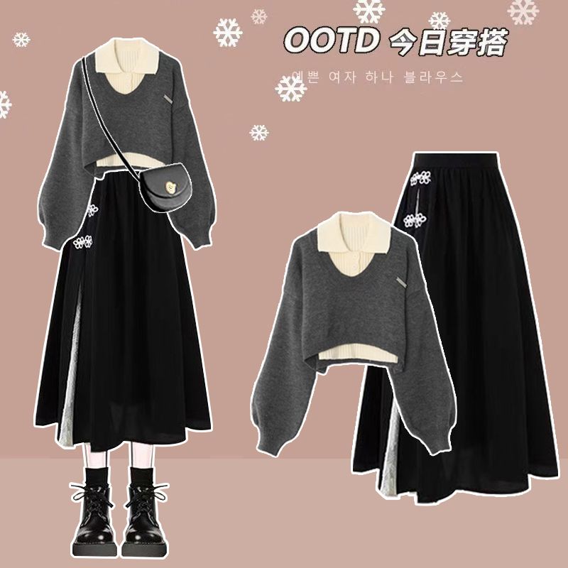 时尚套装POLO领毛衣女秋高腰两件套搭配复古盘扣新中式A字半身裙