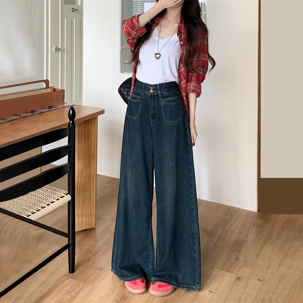 300斤特大码复古两粒扣高腰阔腿牛仔裤女胖mm梨形身材百搭长裤子