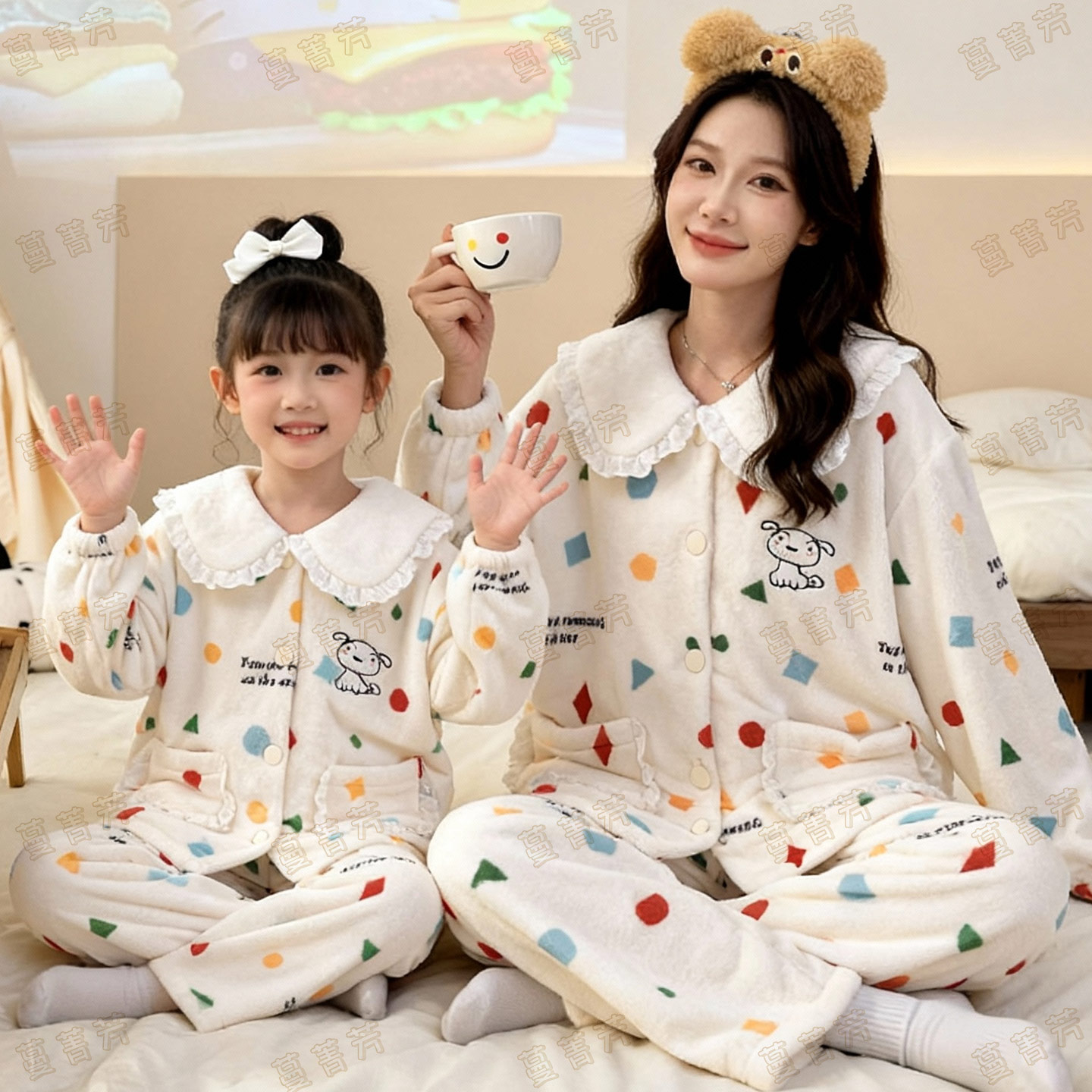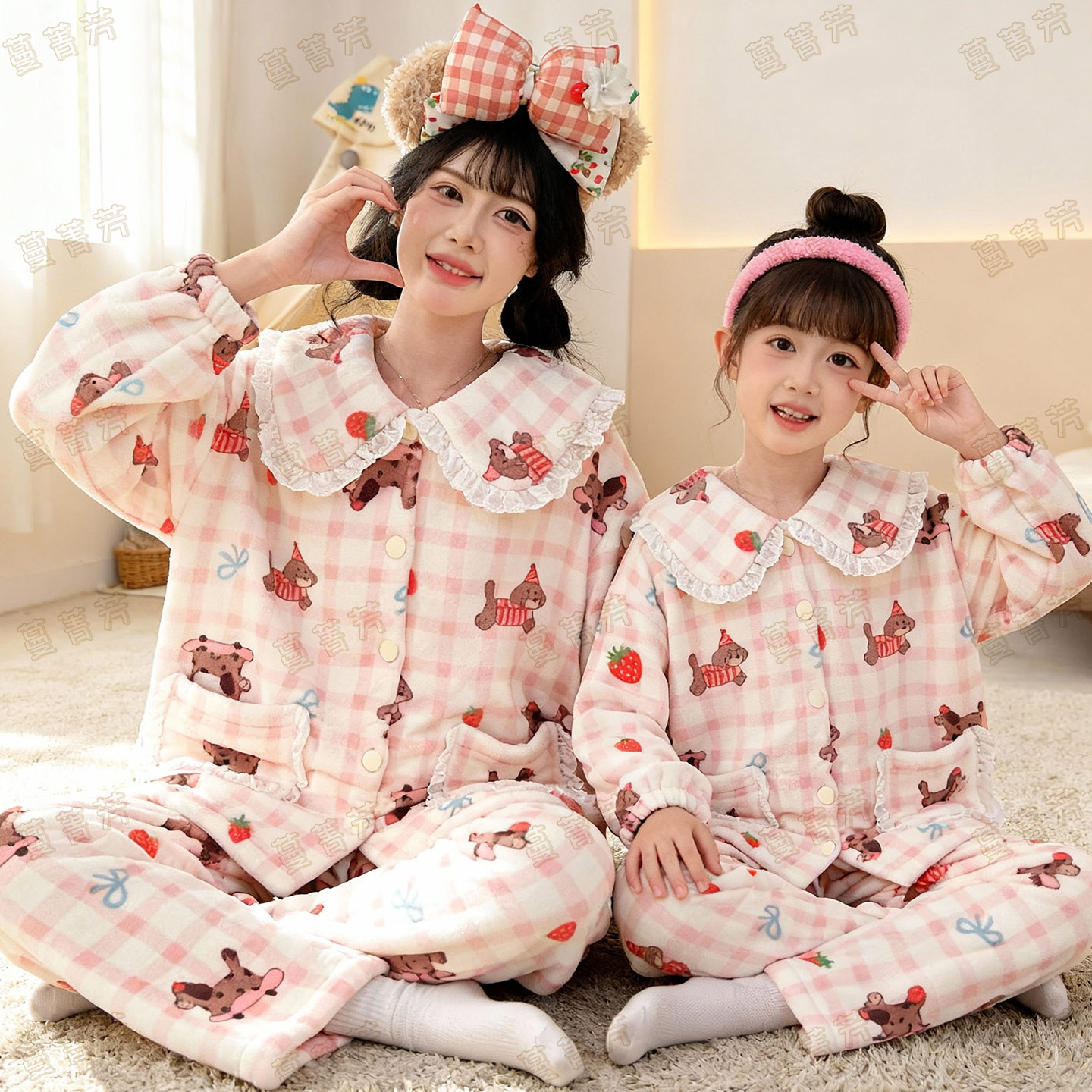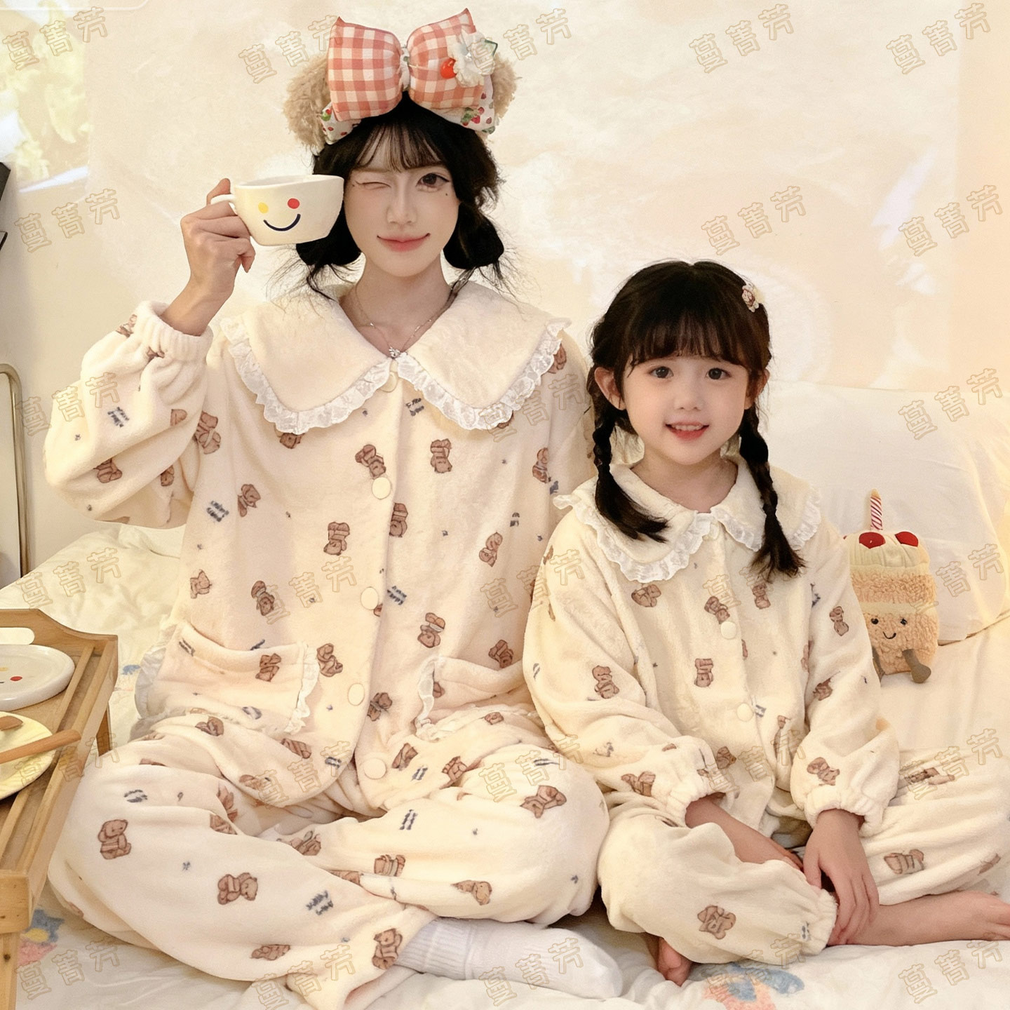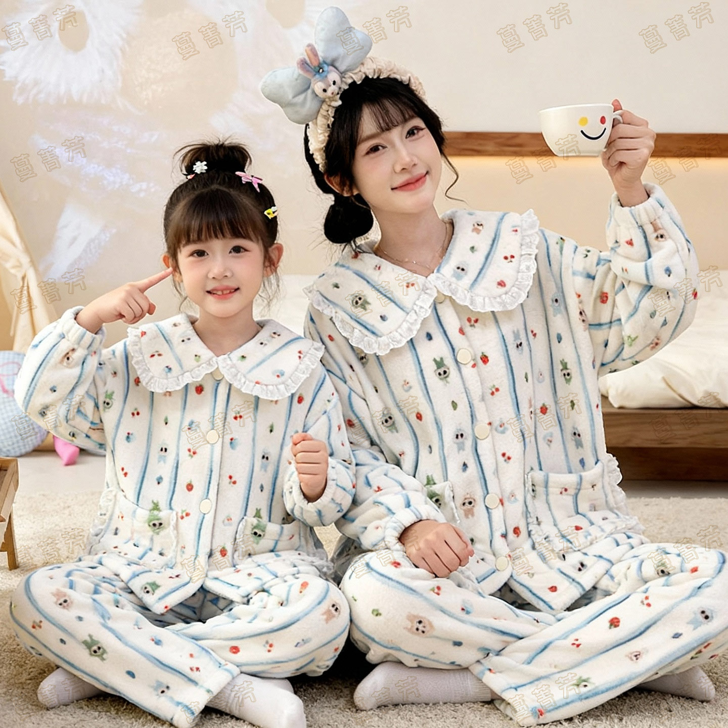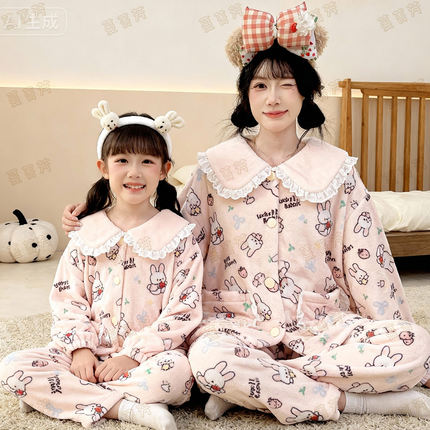 儿童家居服女童法兰绒加厚秋冬季大童可爱兔子宝宝亲子母女装睡衣
