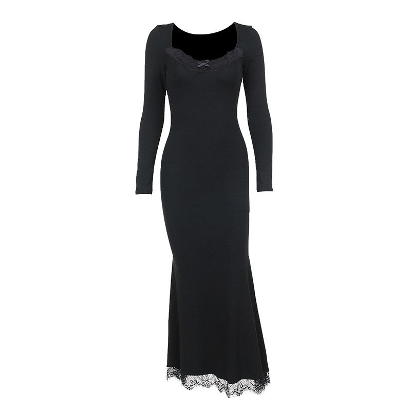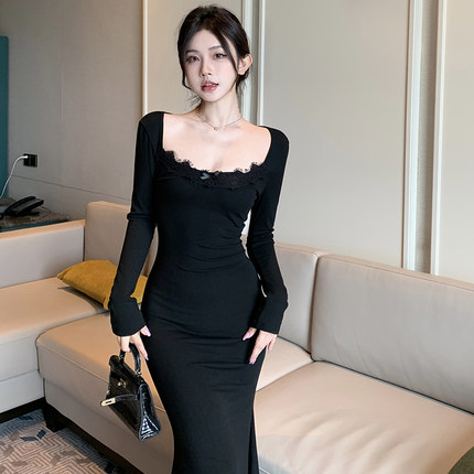 GirlsAt18 黑色鱼尾连衣裙女秋冬性感蕾丝修身裙子高级晚礼服长裙