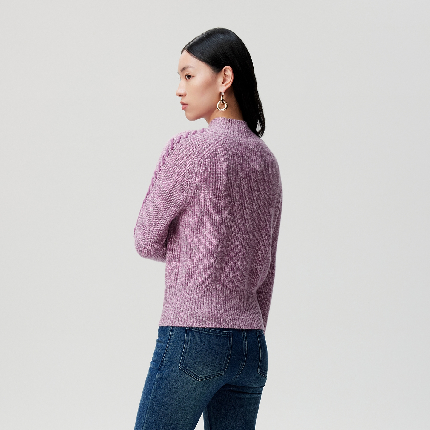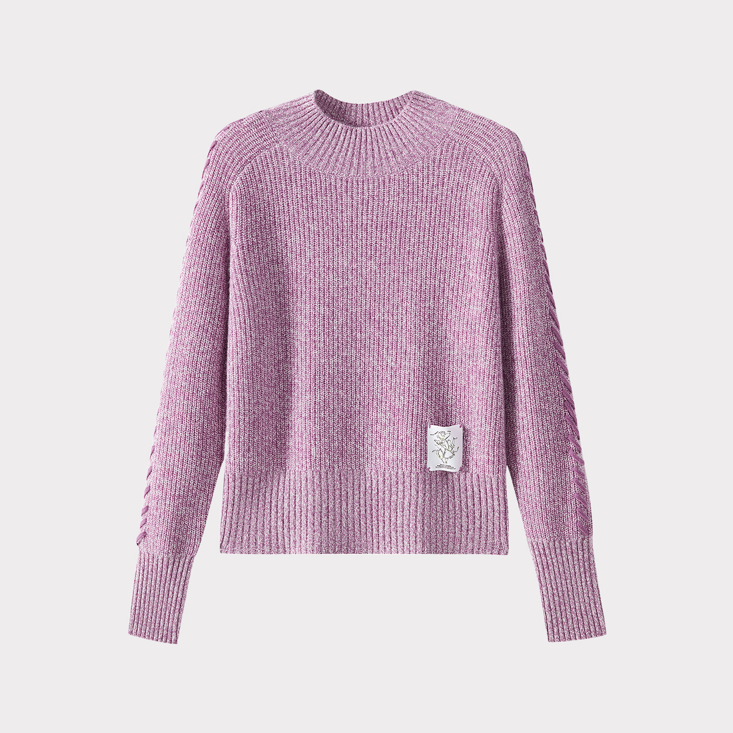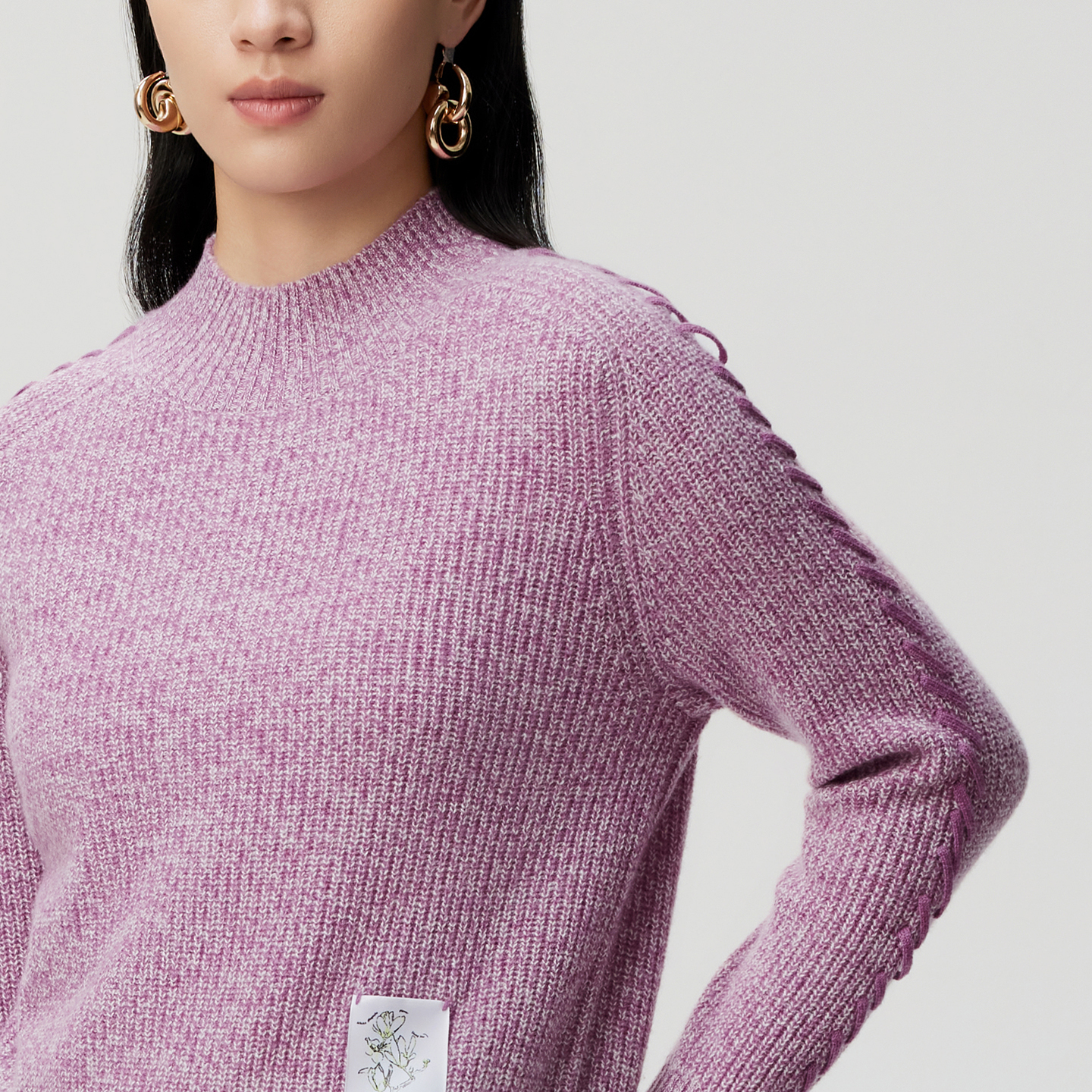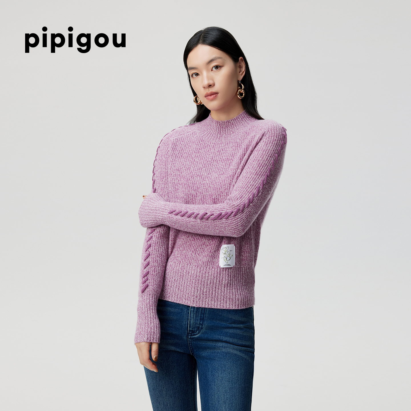 皮皮狗25秋冬新品女士半高领羊绒套衫手钉织标合体版肩部装饰线迹