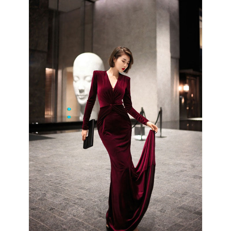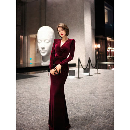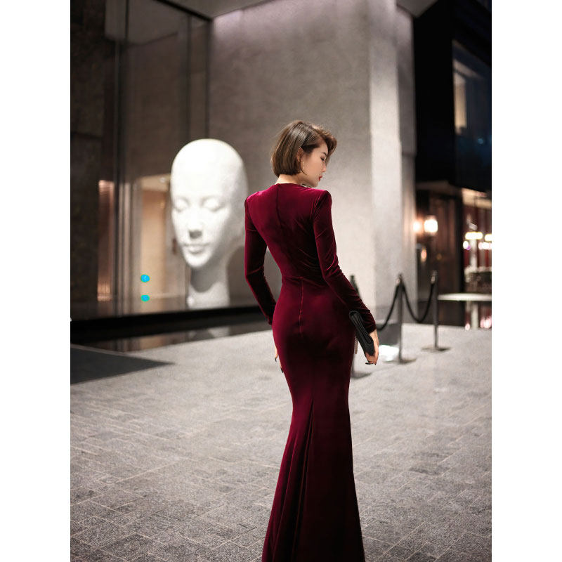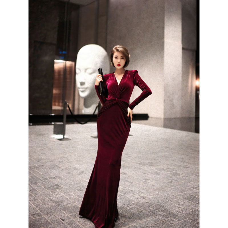 XULU原创纯色气质丝绒包臀鱼尾裙优雅知性直角肩扭结V领连衣裙