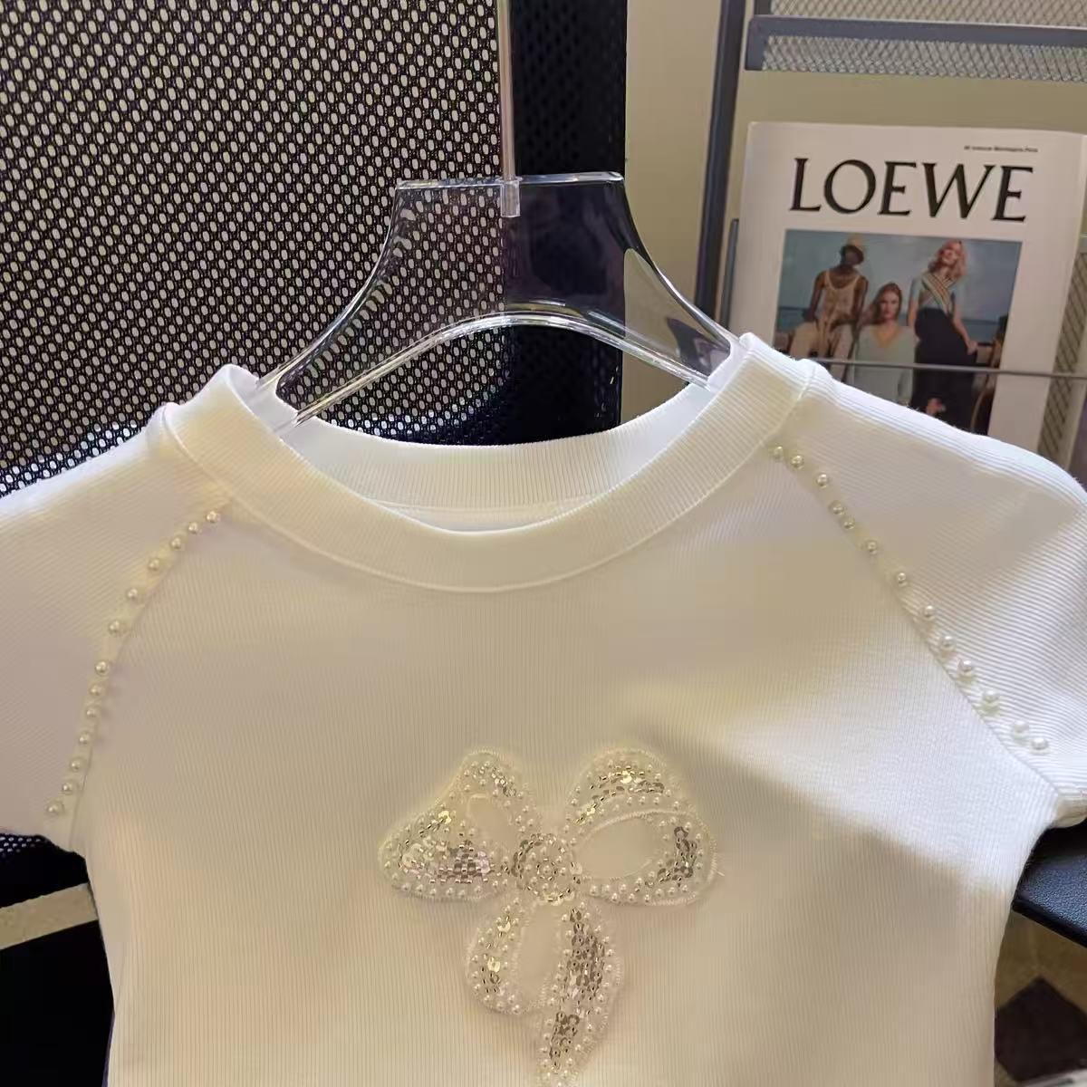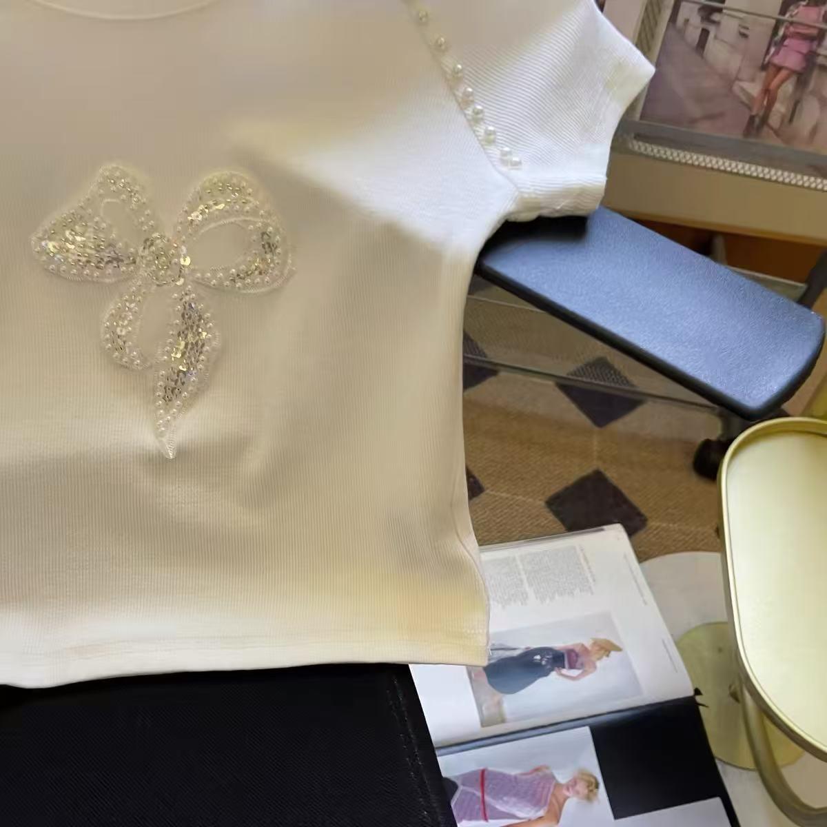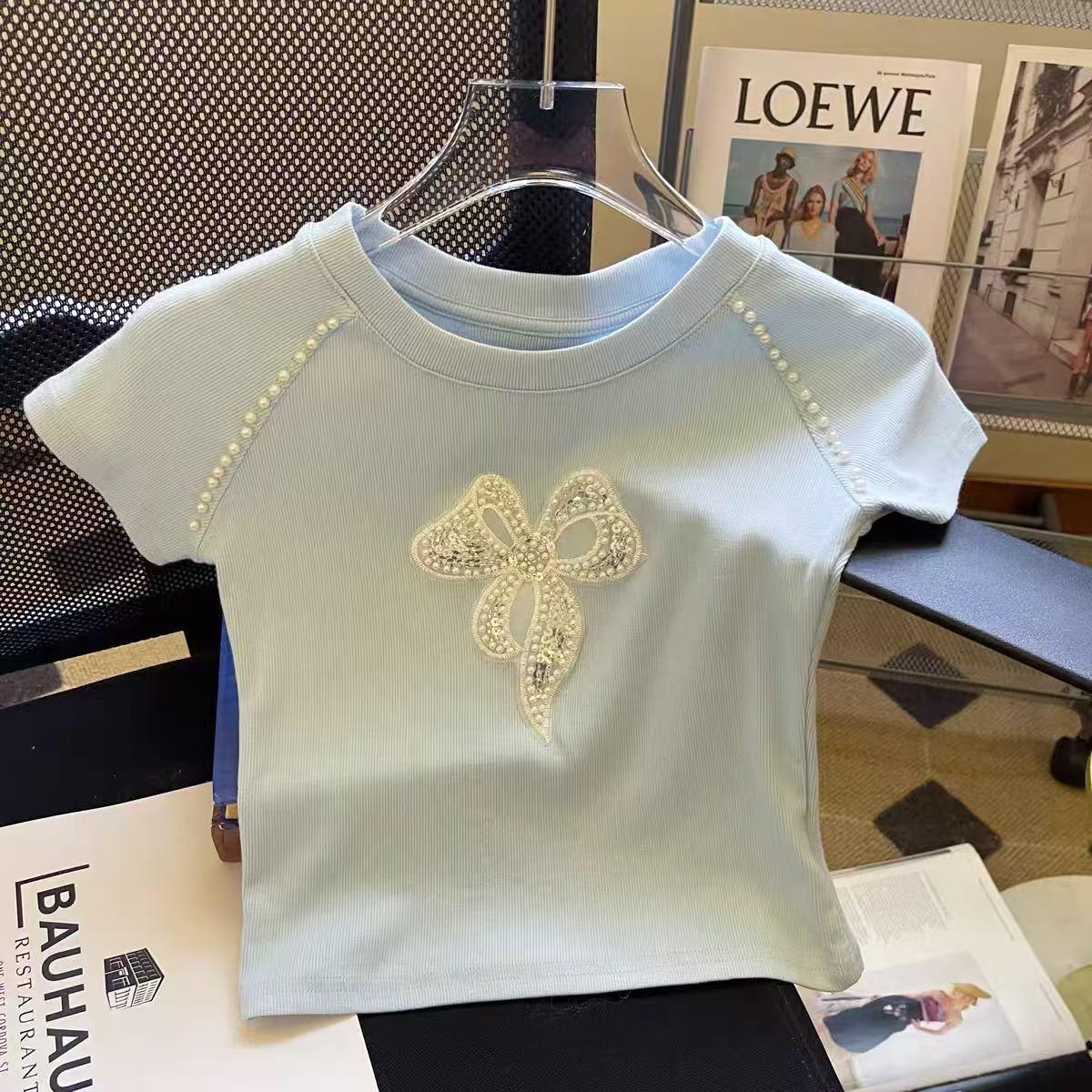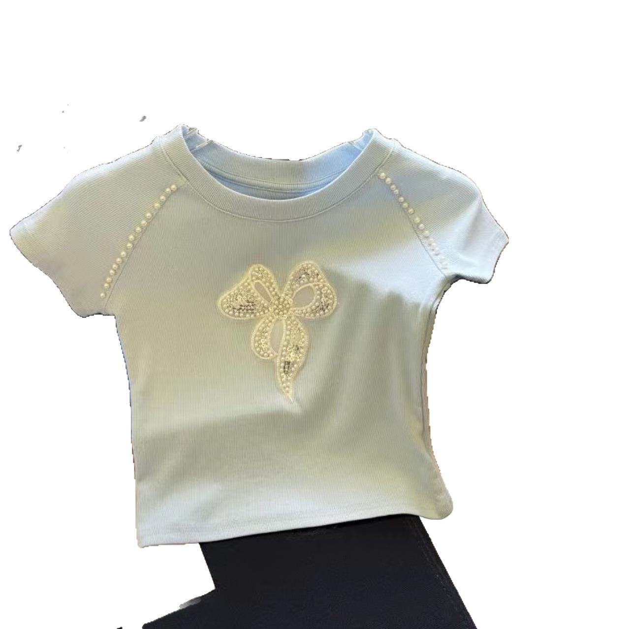 女童短袖T恤夏季新款儿童洋派蝴蝶结珍珠上衣夏装女孩半袖T恤