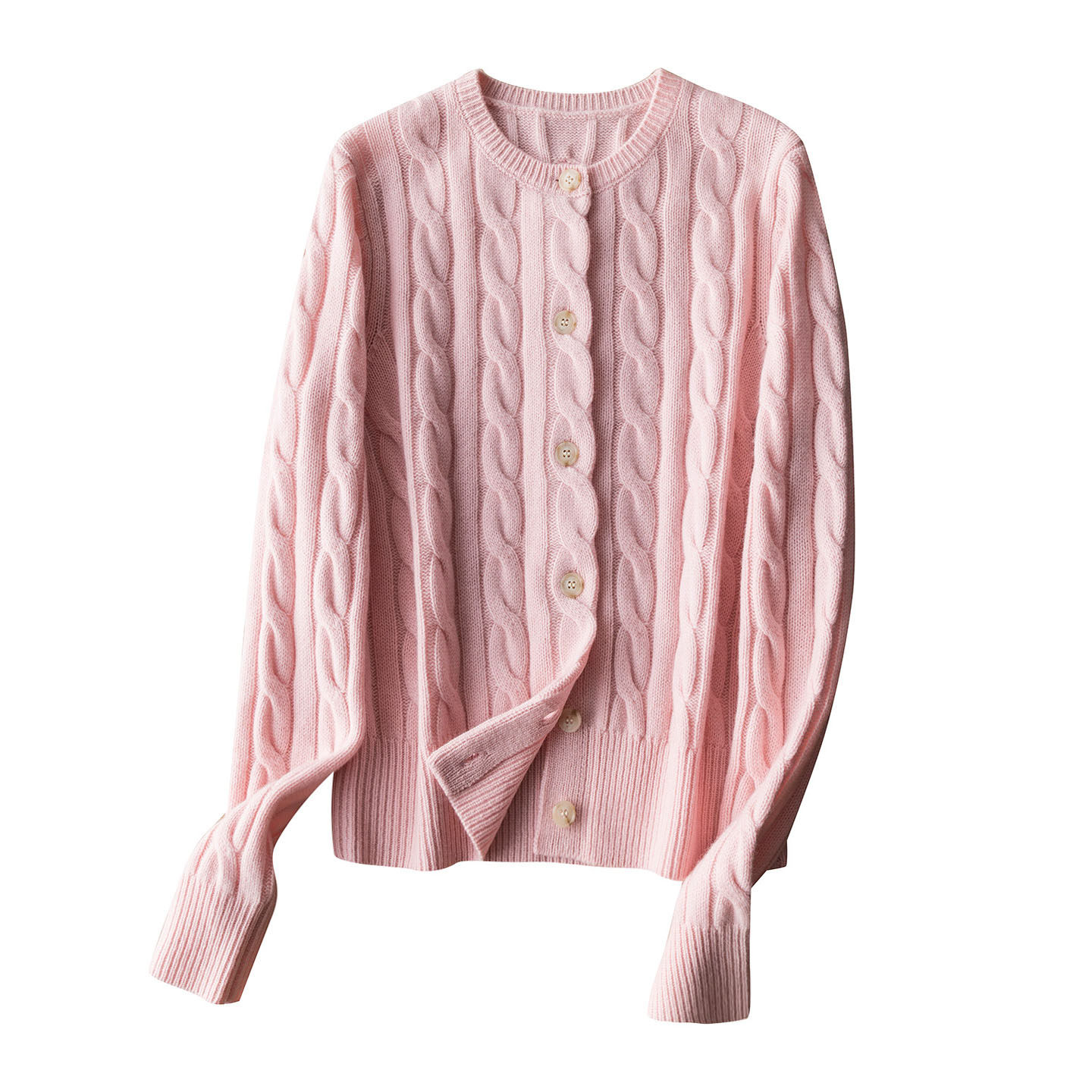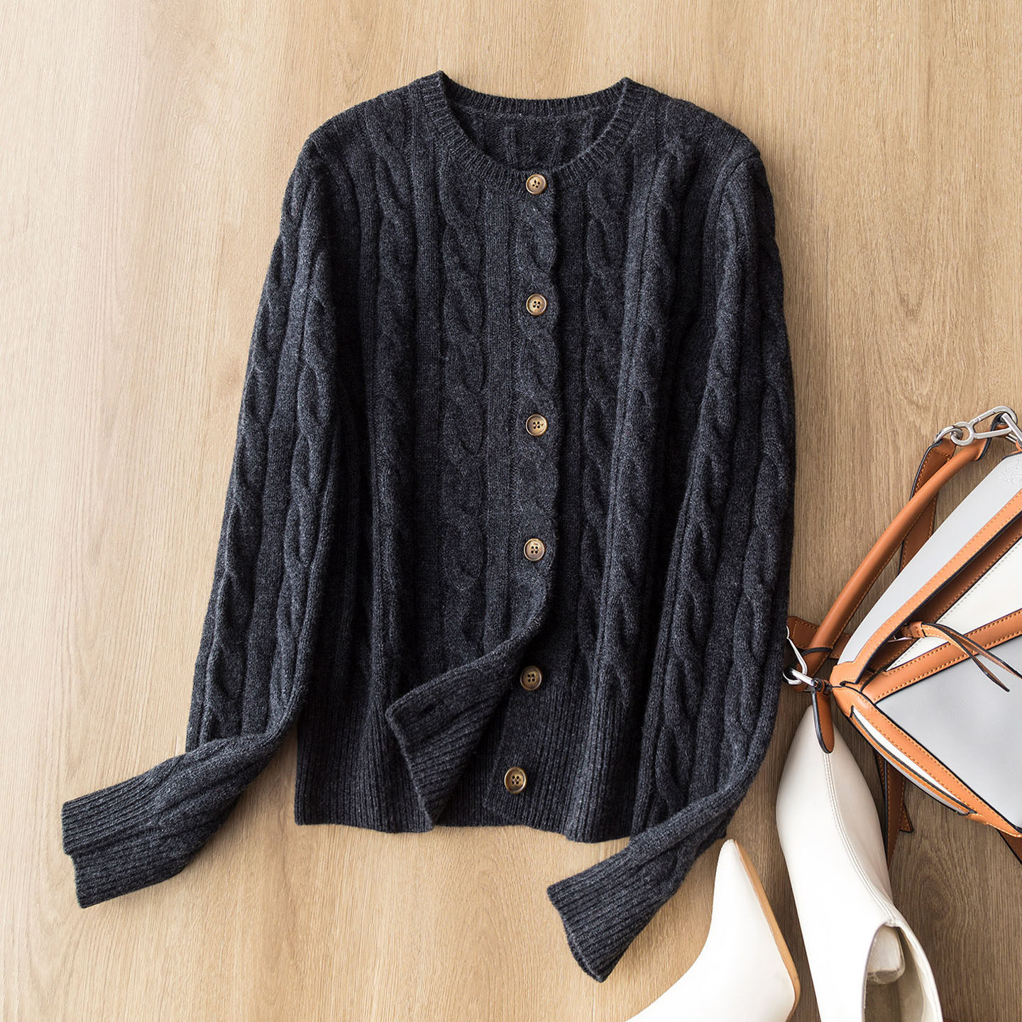 口碑经典款 澳洲100%绵羊毛 厚实复古绞花圆领针织开衫毛衣外套女