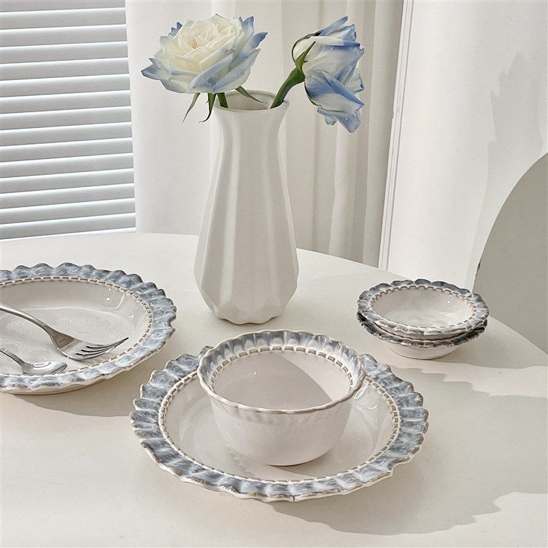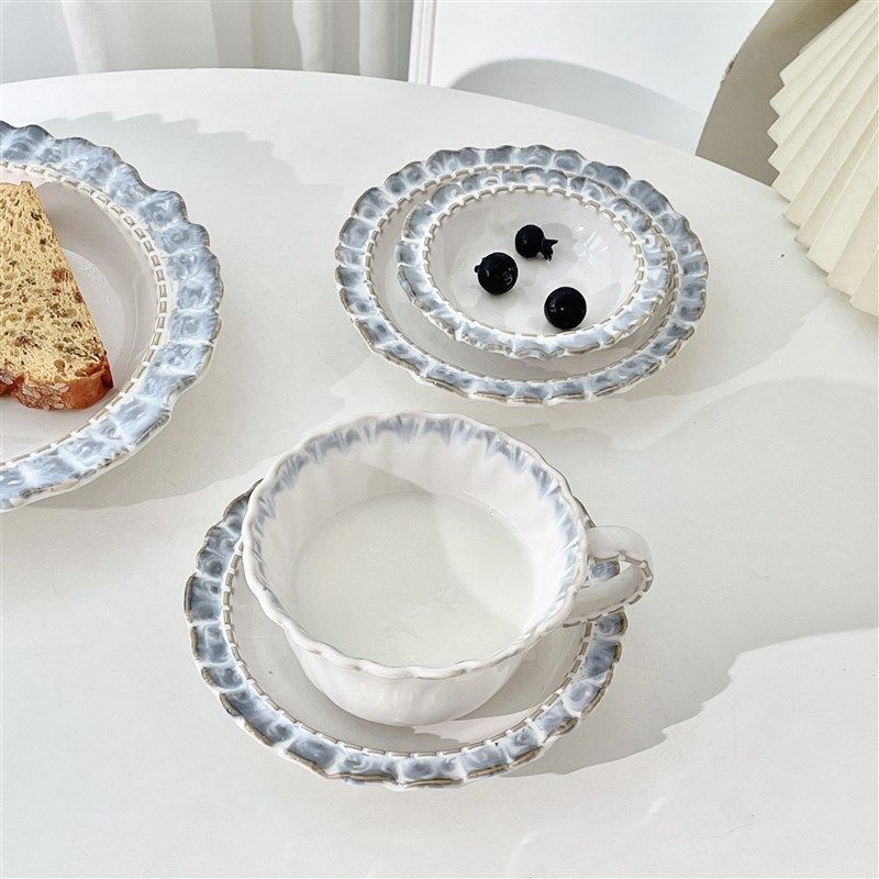 烟蓝花边陶瓷餐具法式复古釉下彩杯碟套装甜品水果盘子家用牛奶杯