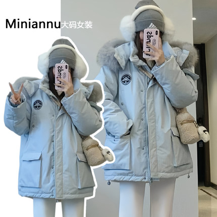 300斤大码女装韩版学院风蓝色棉服女胖mm宽松加厚保暖派克服外套