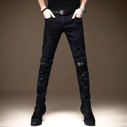 高端夏季新款破洞补丁牛仔裤男潮牌嘻哈泼墨修身小脚男士潮流裤子