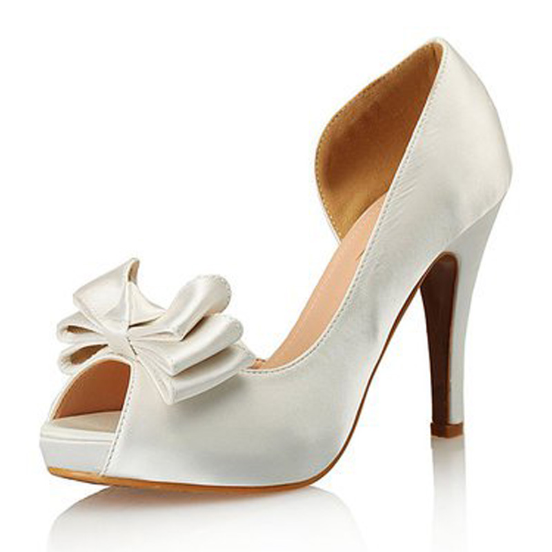 欧美蝴蝶结防水台绸缎面细高跟白色鱼嘴伴娘鞋婚纱鞋女婚鞋新娘鞋