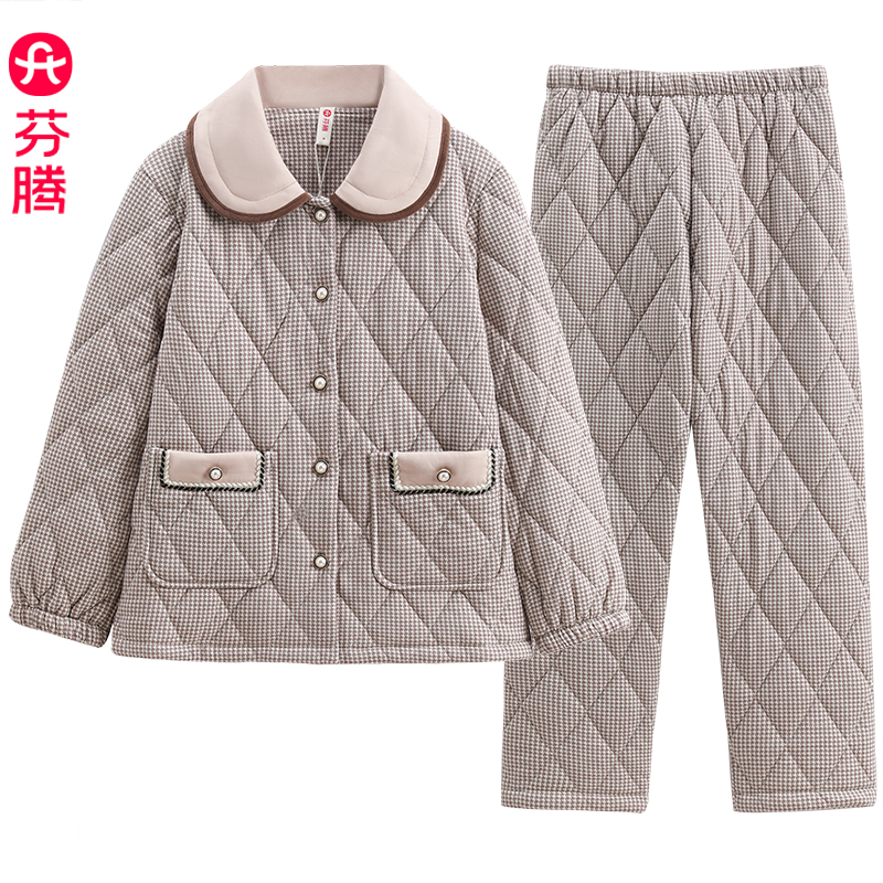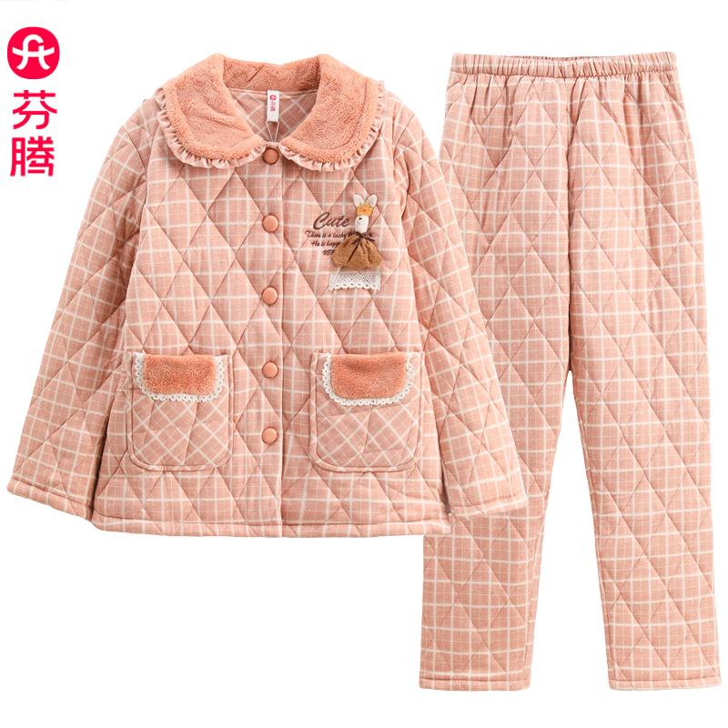 芬腾睡衣女冬季纯棉夹棉三层保暖秋冬甜美可爱格子全棉家居服套装