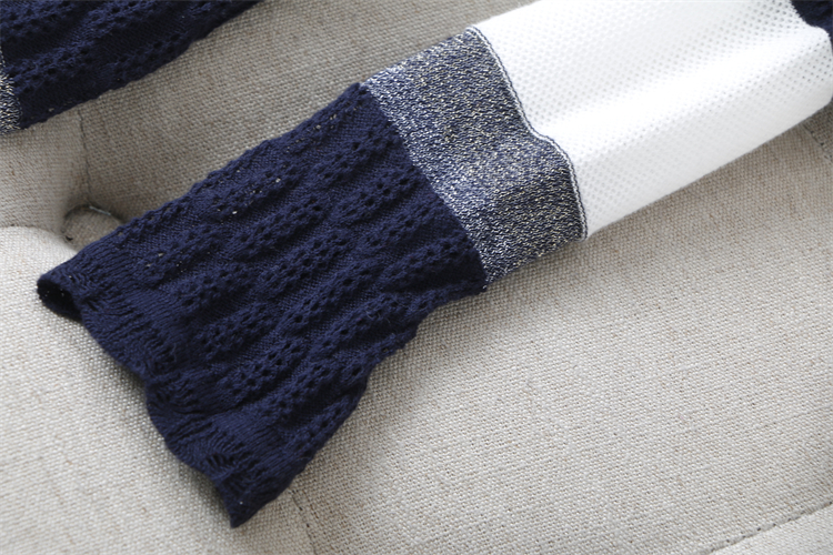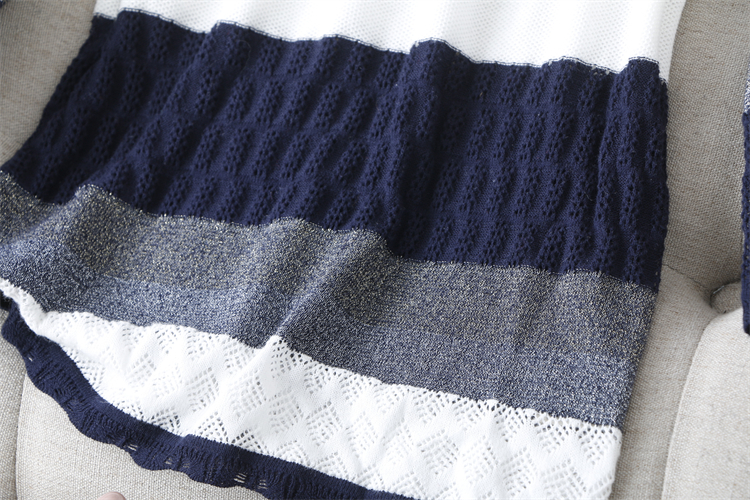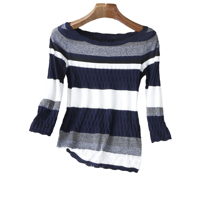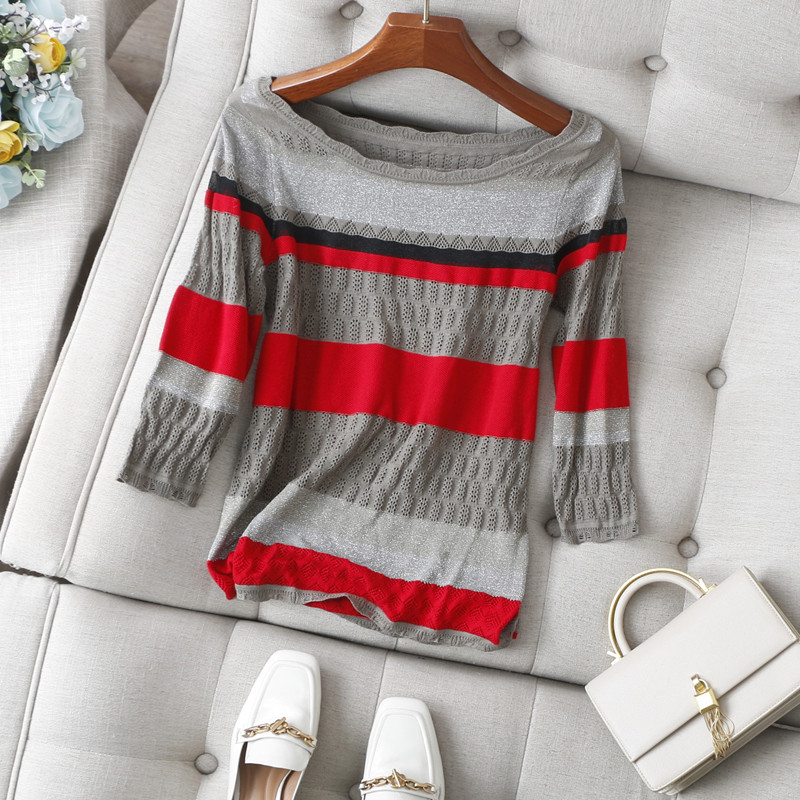 夏日清仓~亮丝撞色条纹波浪花边圆领七分袖棉质薄款套头针织衫女