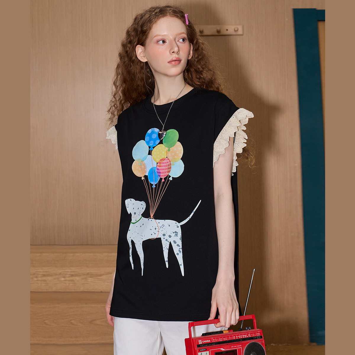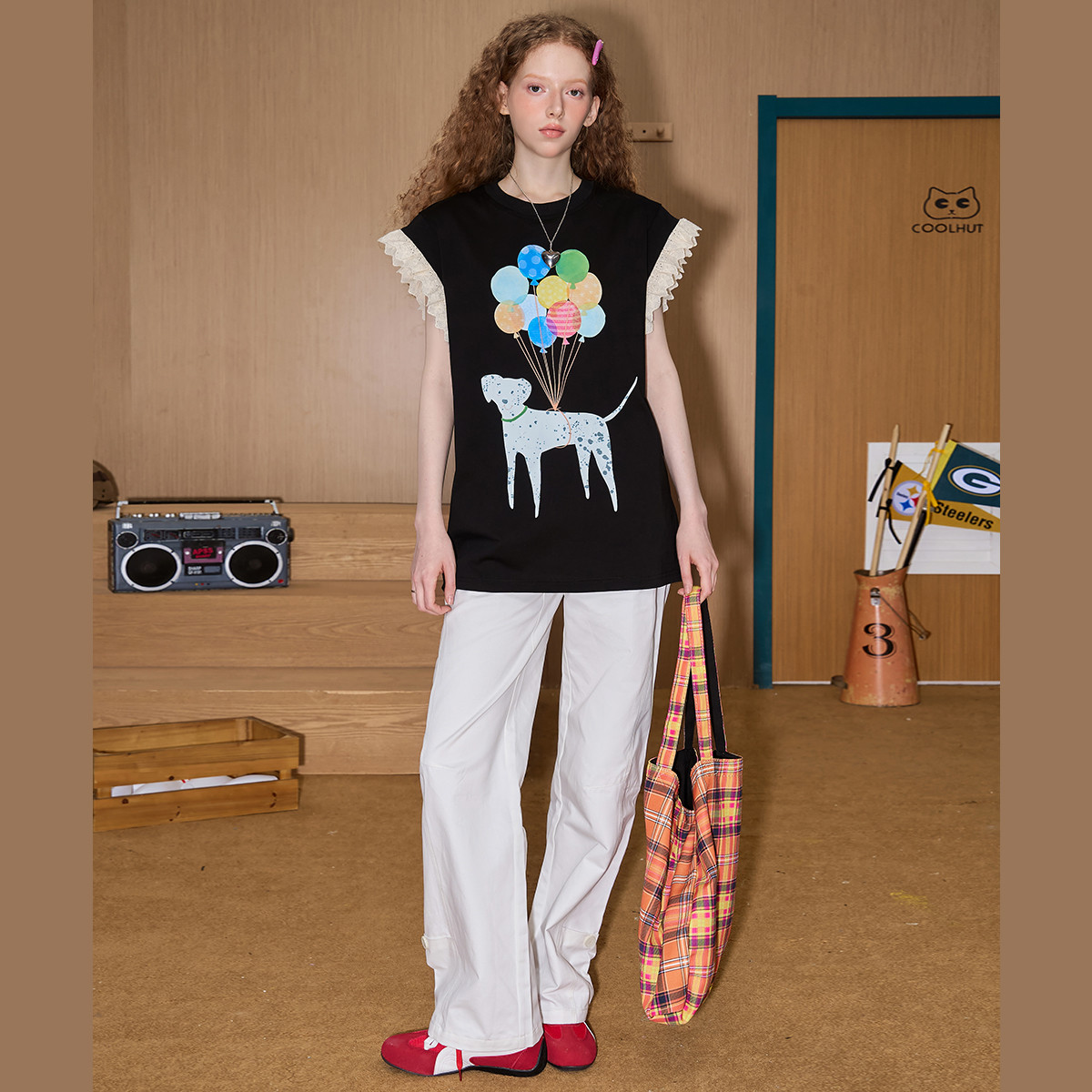 coolhut撞色花边印花少女圆领休闲宽松2025夏季黑色短袖T恤女