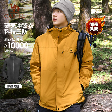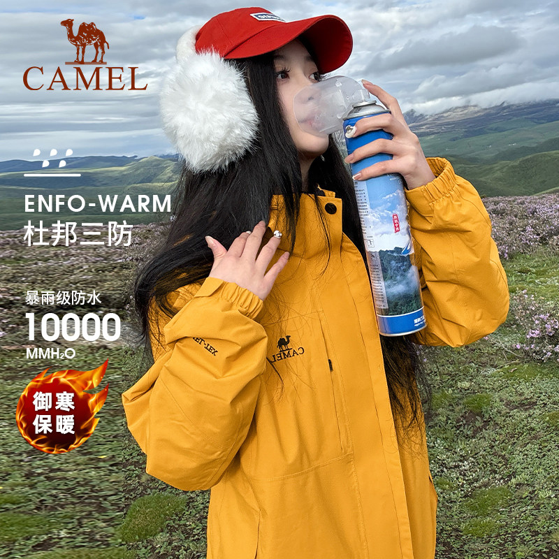 骆驼雨神谷子黄冲锋衣男三合一户外新款加绒防风防水外套登山服女