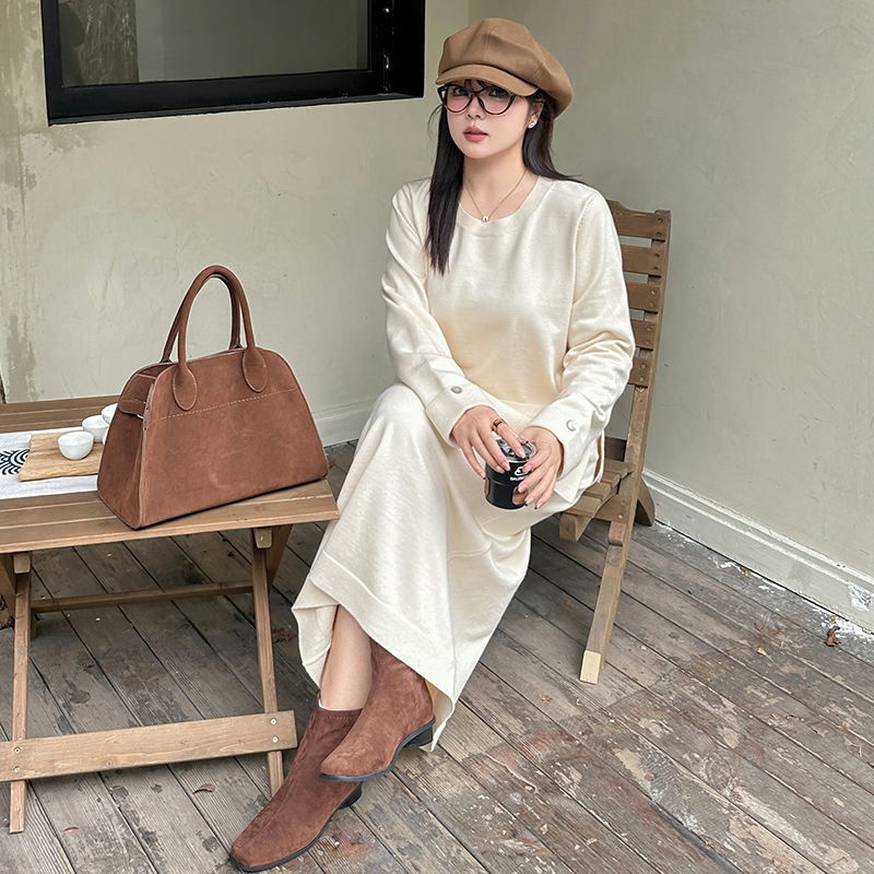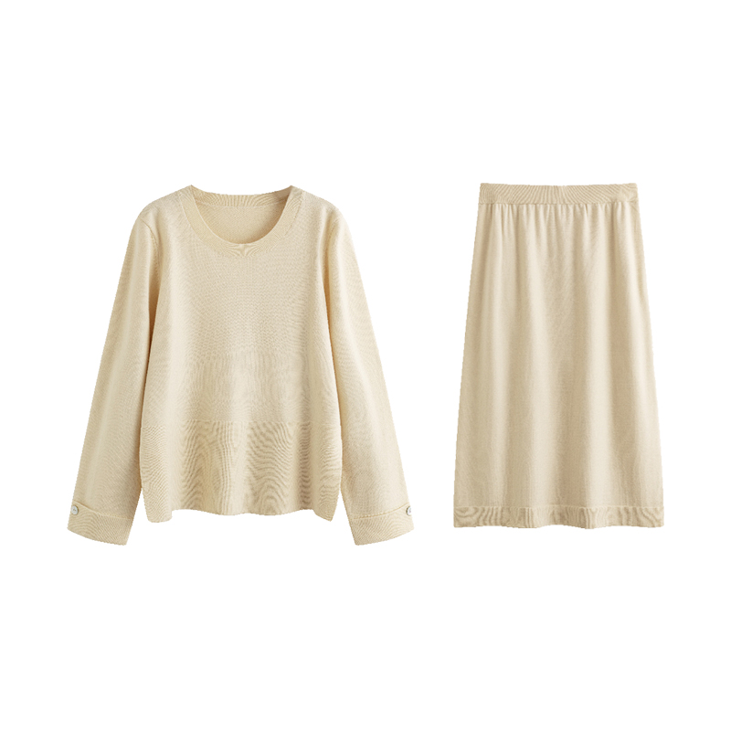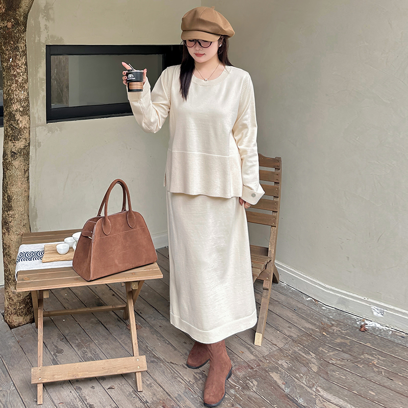 大码女装圆领休闲针织套装2024秋冬胖mm宽松百搭上衣女半裙两件套