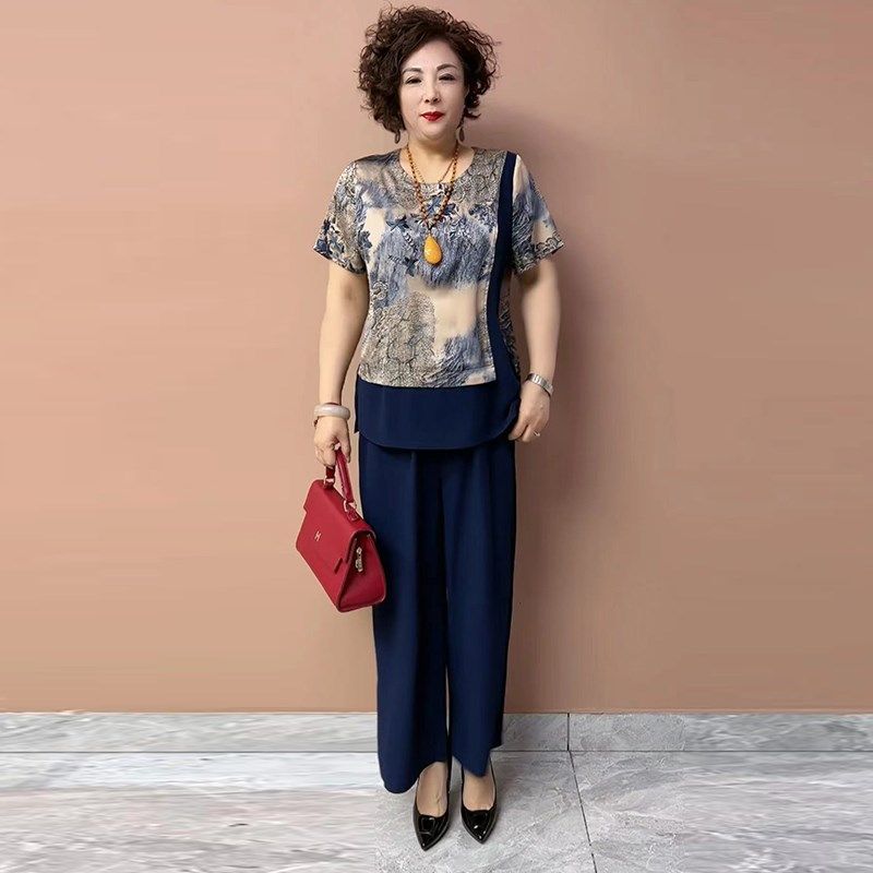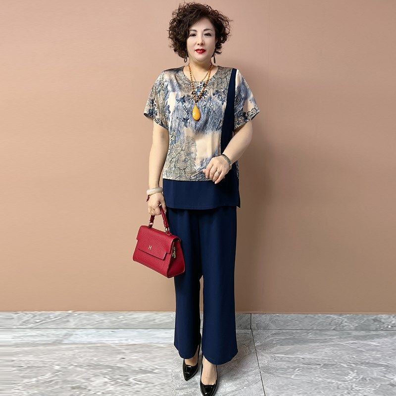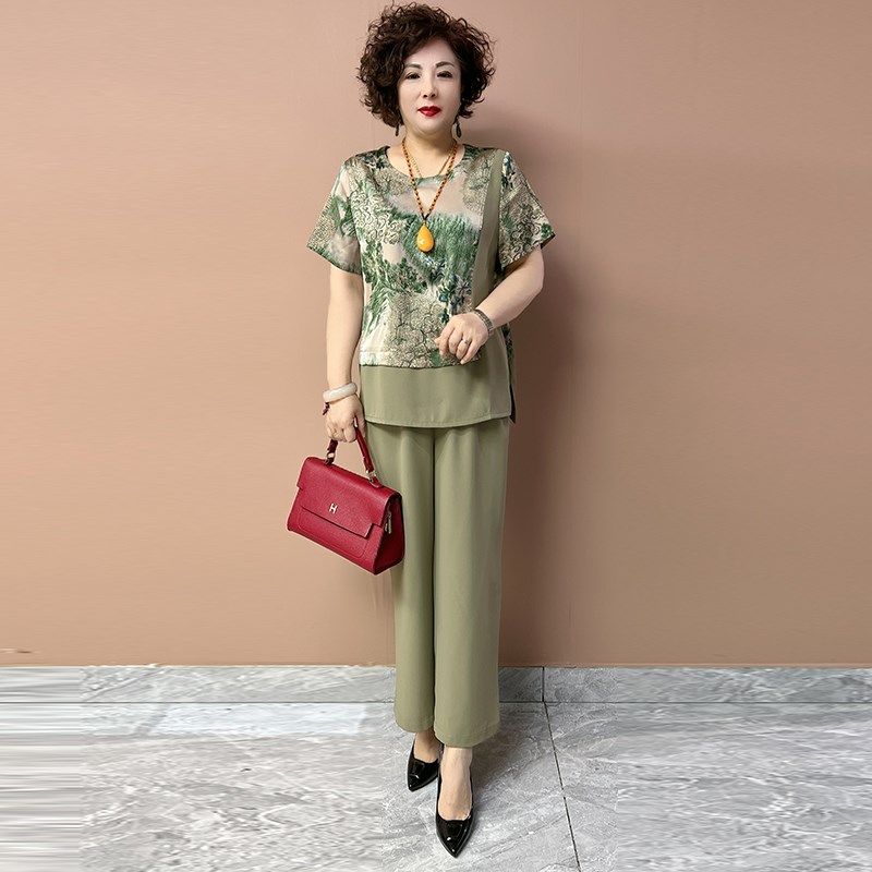 中老年妈妈真丝套装夏季大码宽松短袖上衣搭配高腰直筒裤两件套女