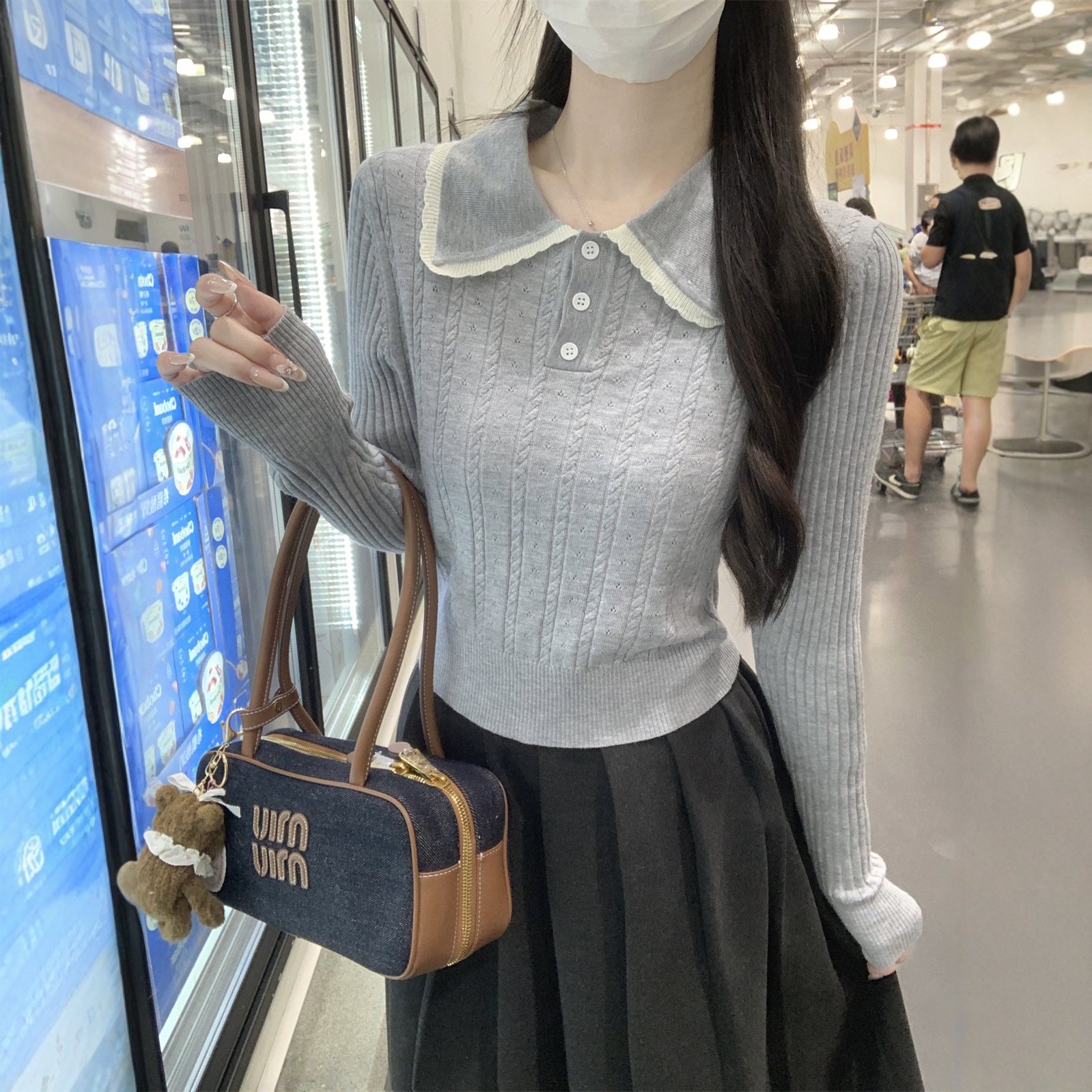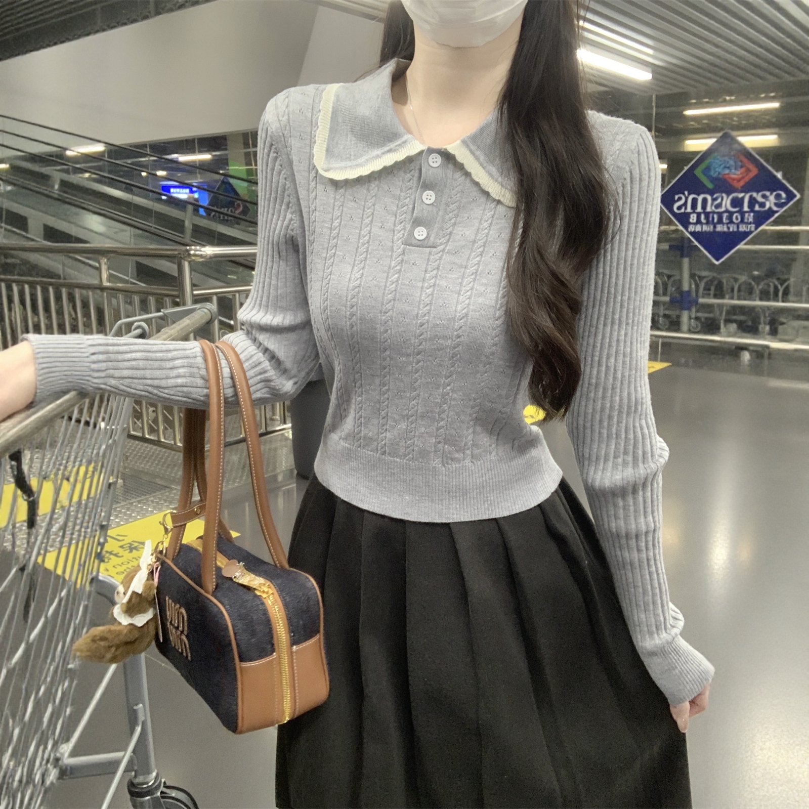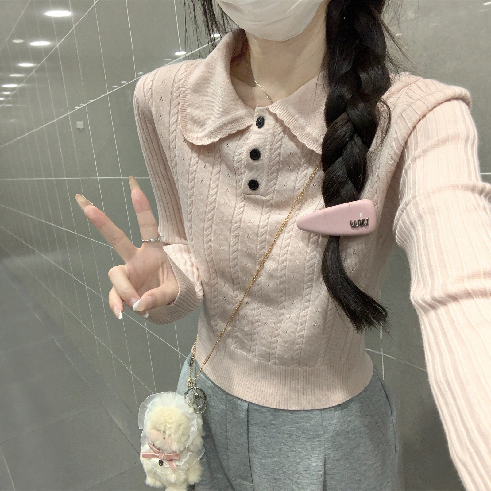 学院风娃娃领麻花针织衫女灰色修身打底衫女内搭毛衣秋高级感上衣