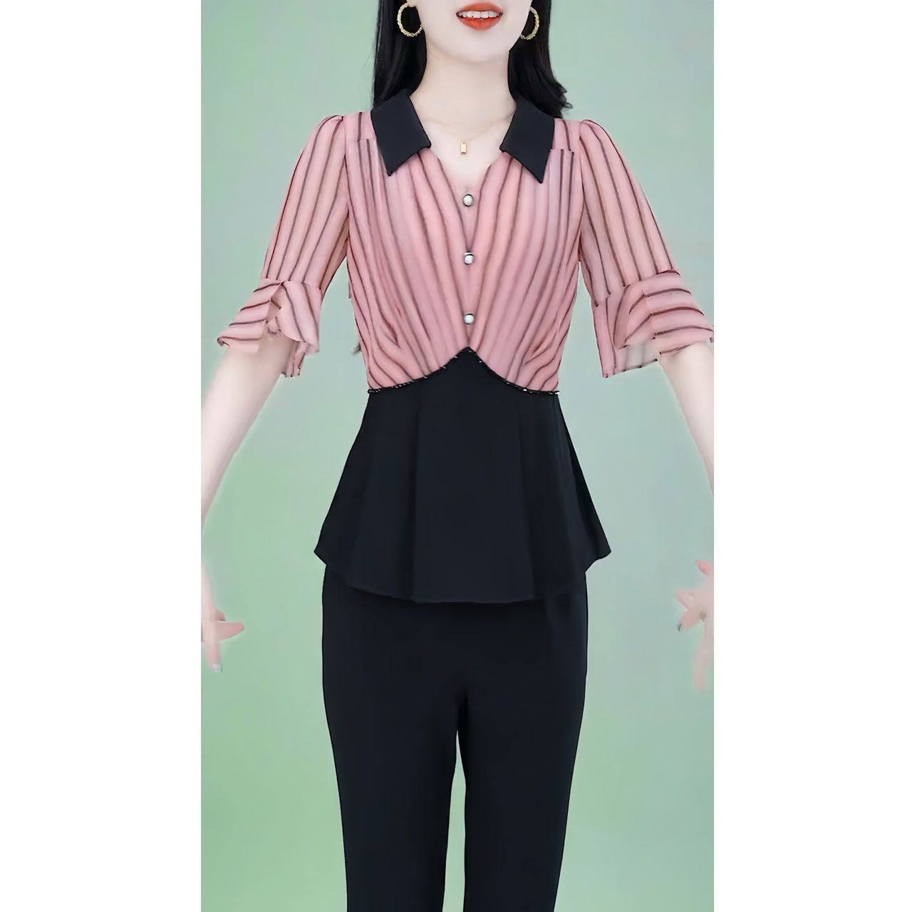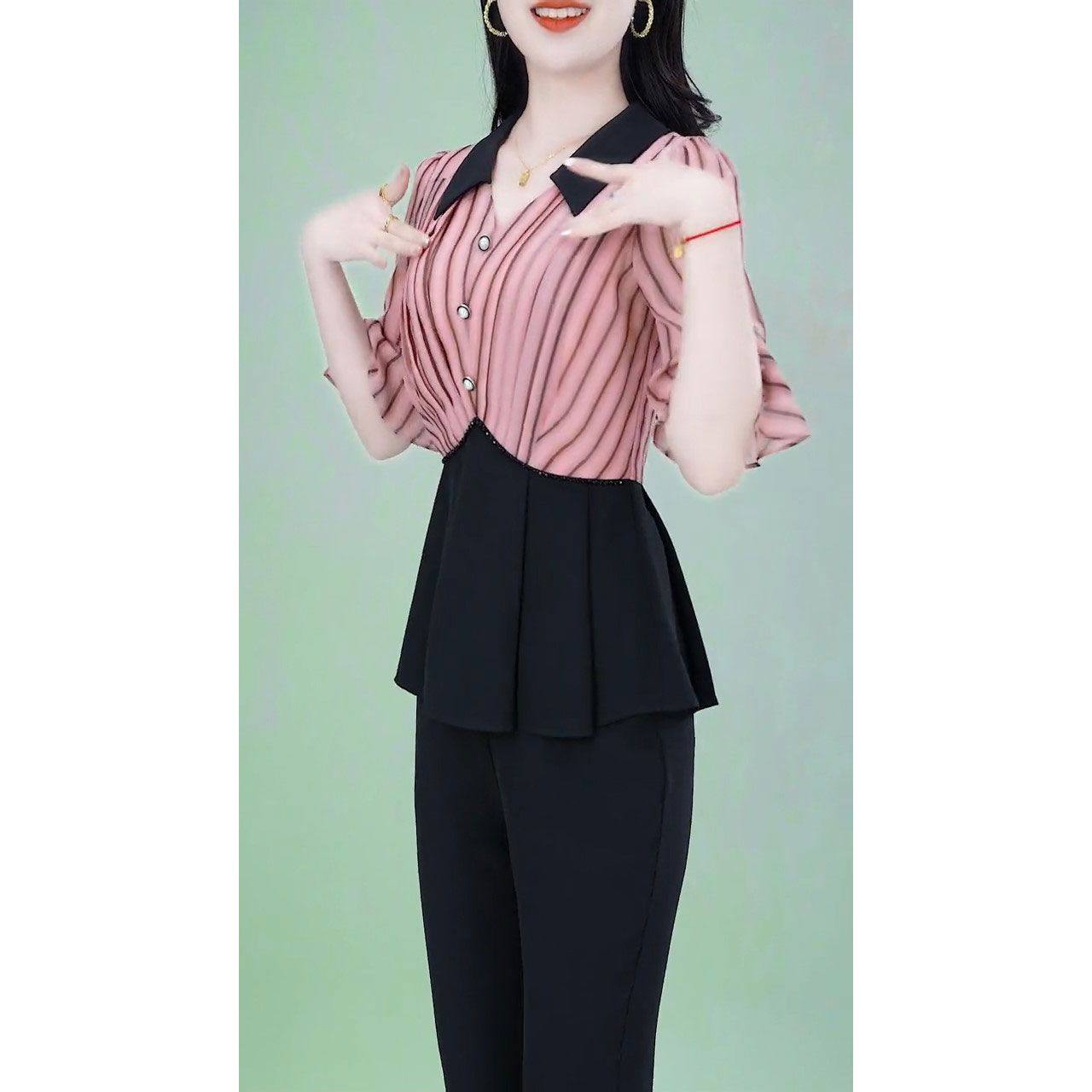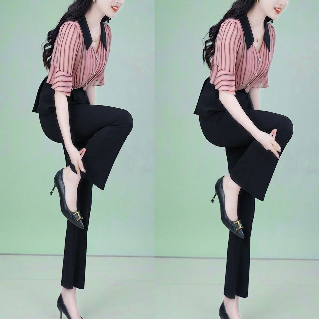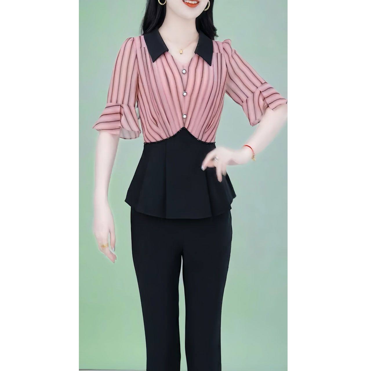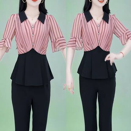 时尚减龄雪纺拼接套装女2025夏季新款条纹短袖上衣微喇叭裤两件套