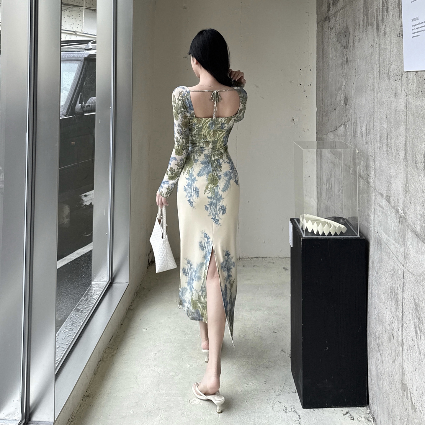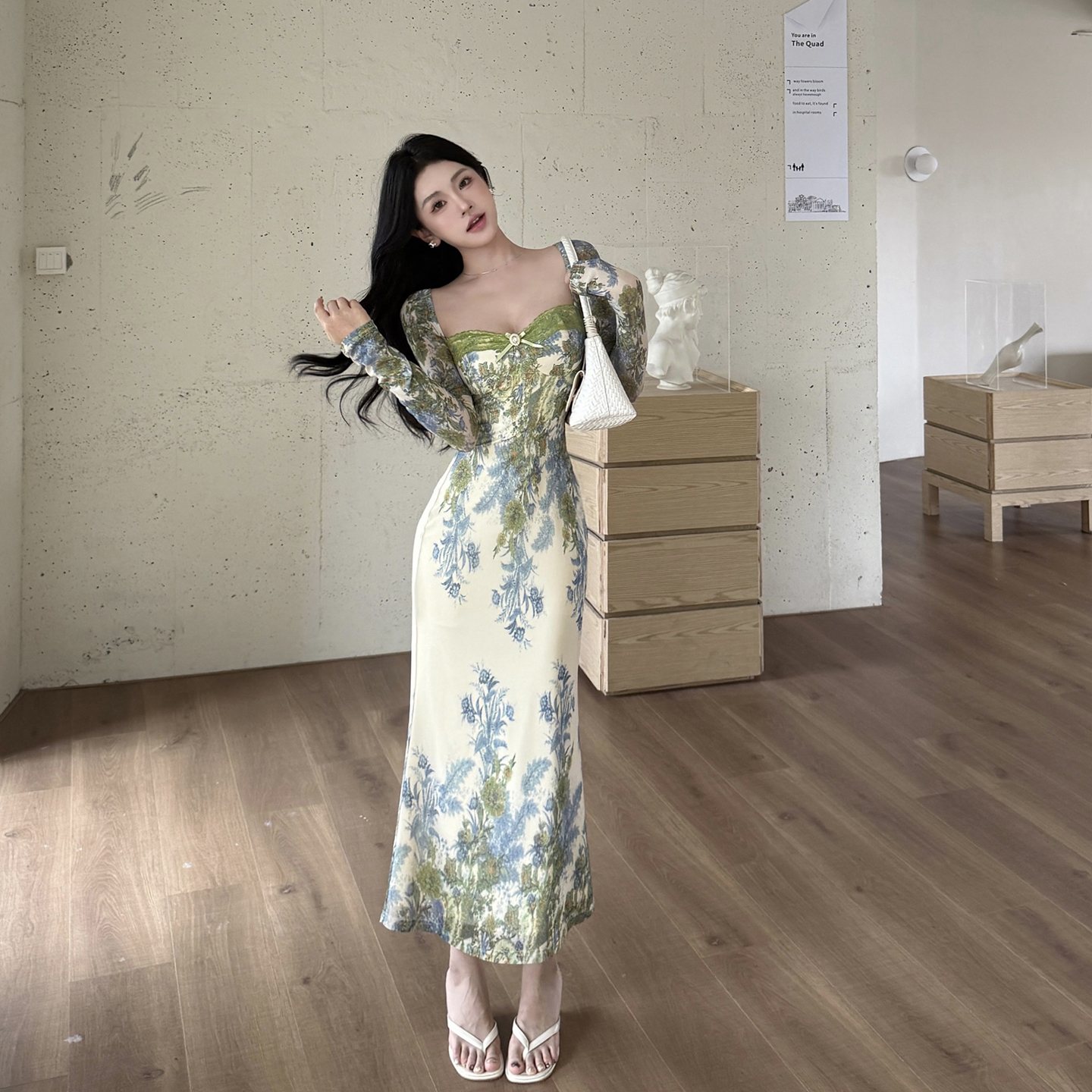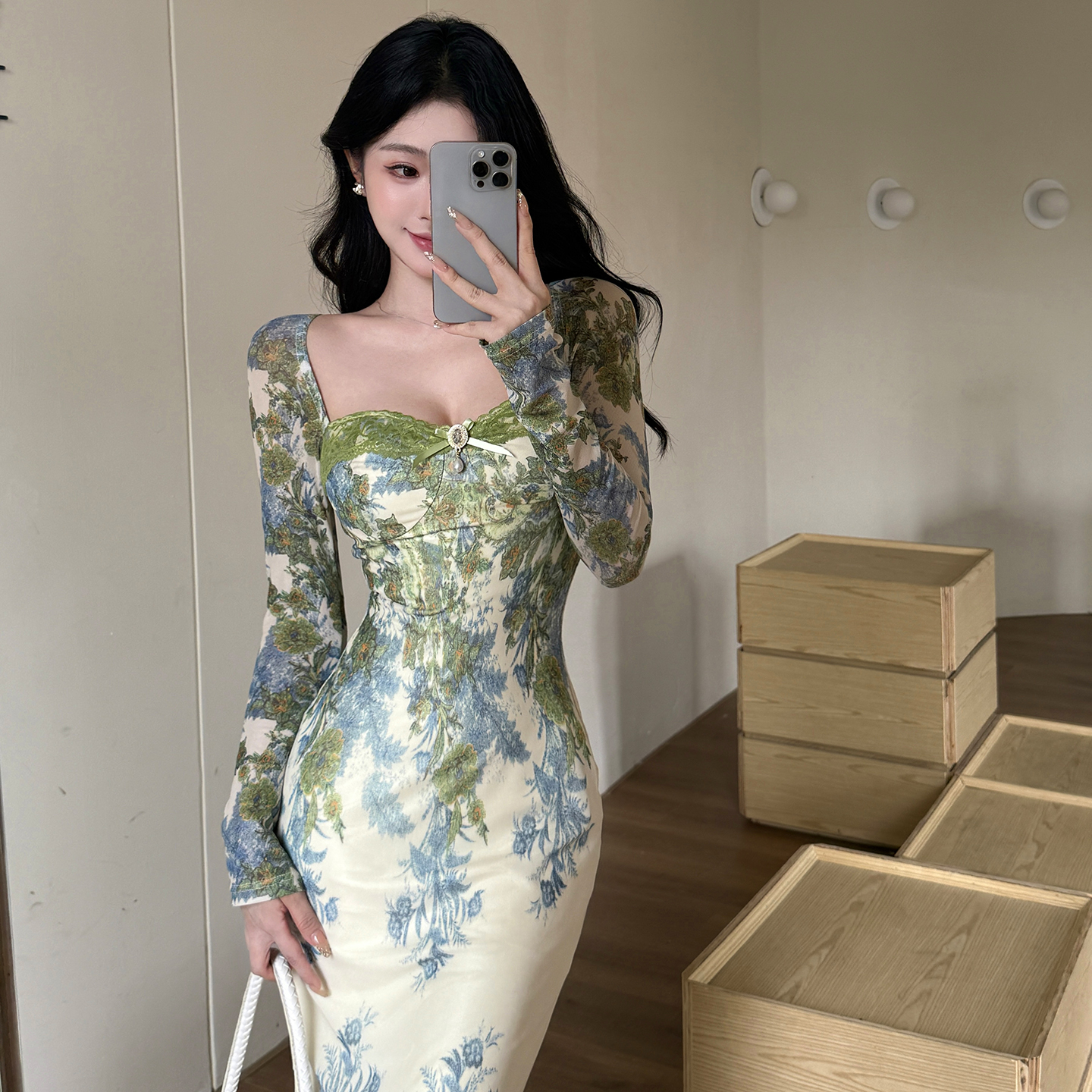 GirlsAt18 绿色印花长袖连衣裙女秋季新款高级感蕾丝气质修身长裙