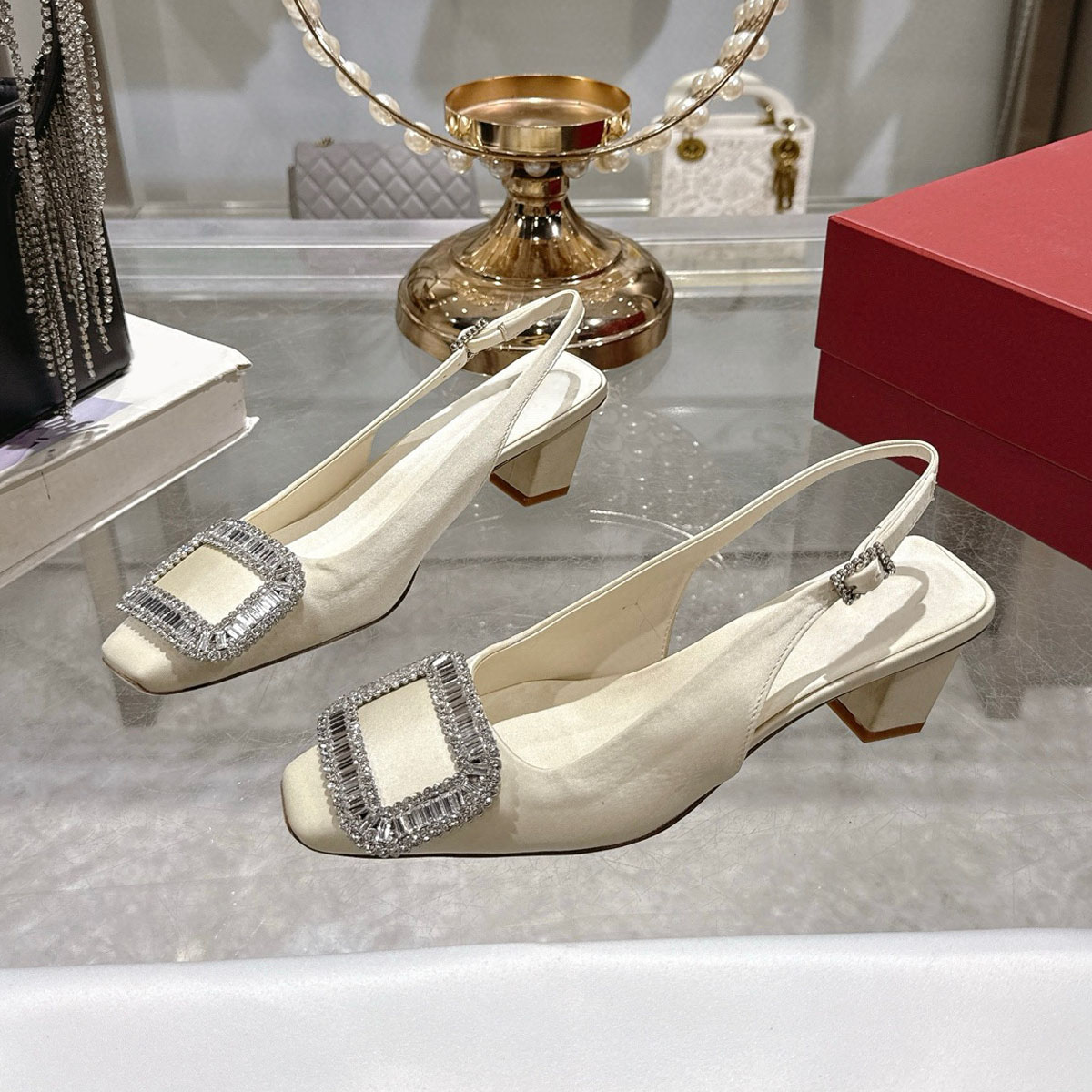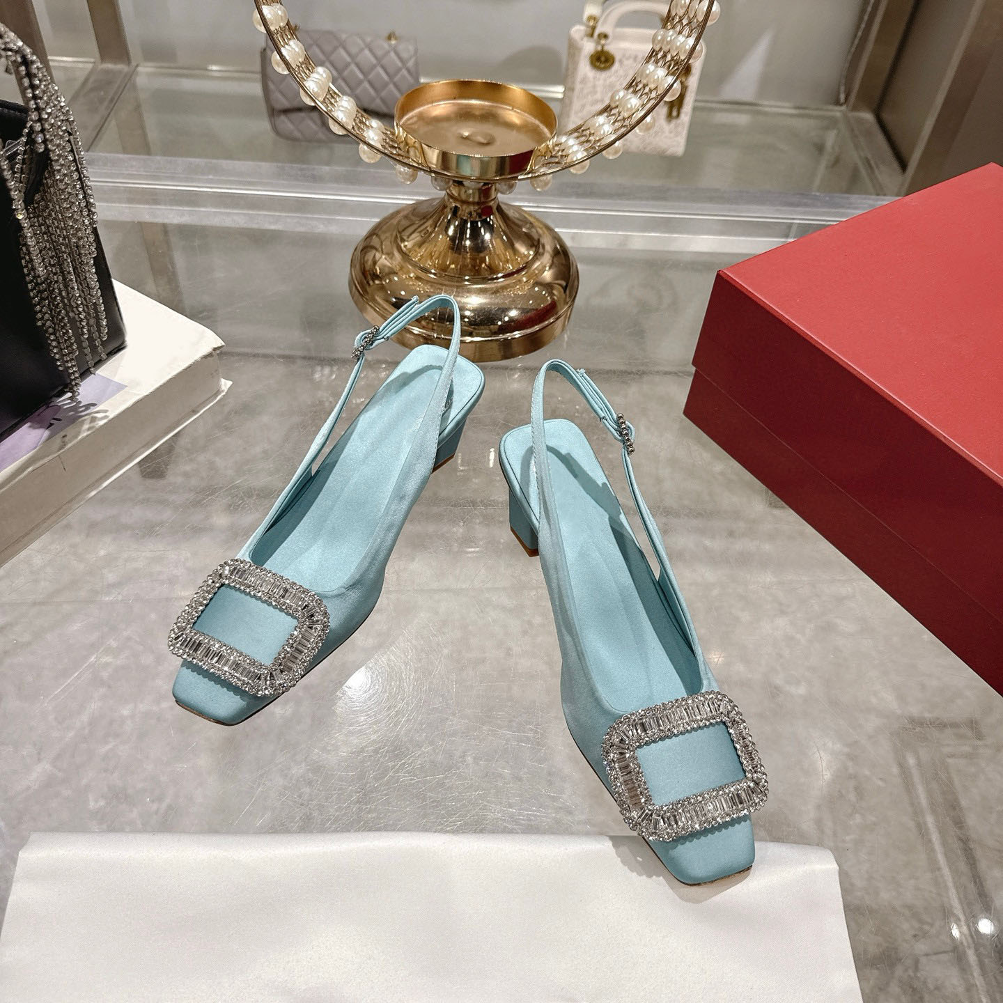 25新款绝美水钻方扣方头凉鞋高级感法式粗跟后空单鞋绸缎高跟鞋女