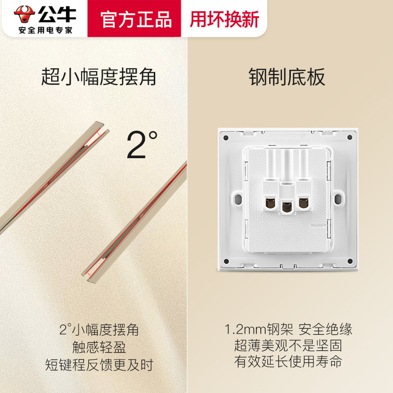 公牛蝶翼超薄开关插座面板奶油风一开五孔插座空调16安G57星辰金