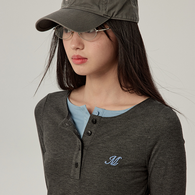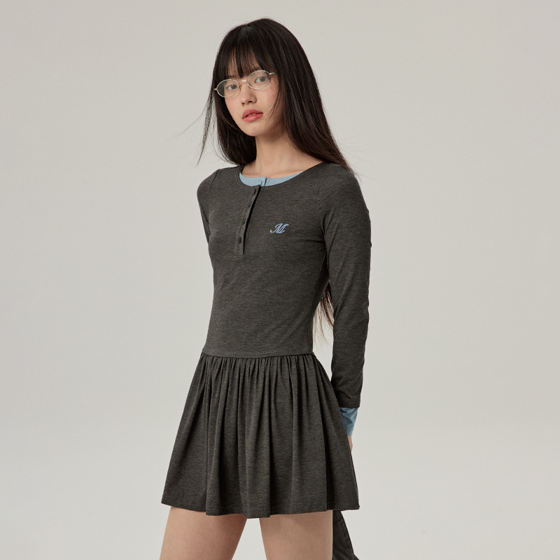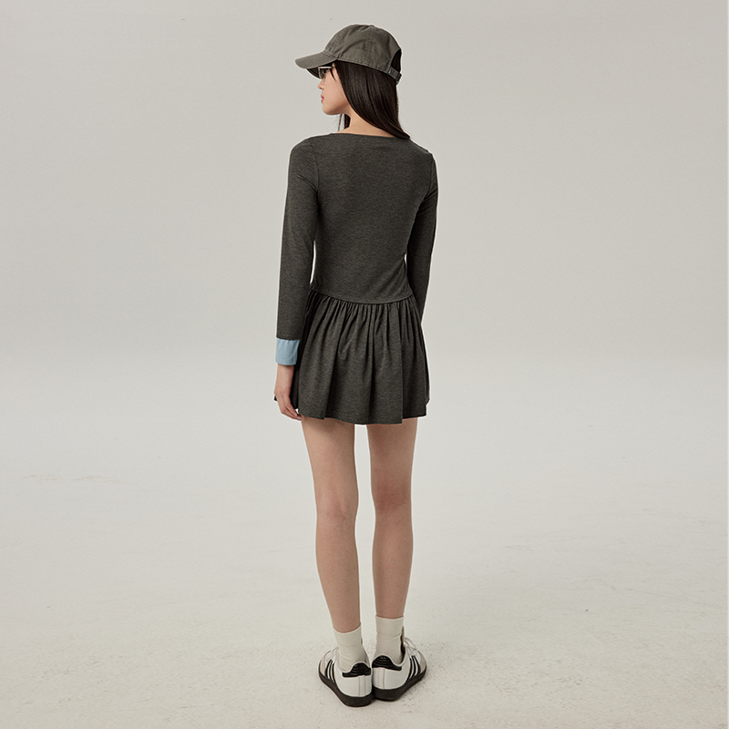 omont蛋挞家 复古假两件针织长袖连衣裙春秋季灰色收腰显瘦短裙