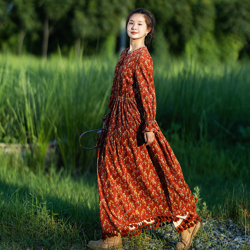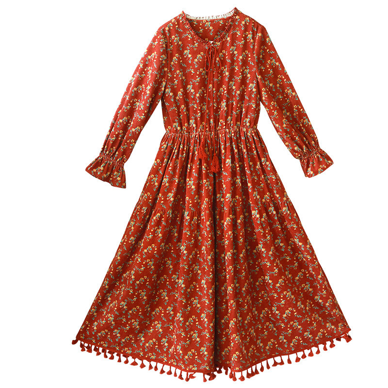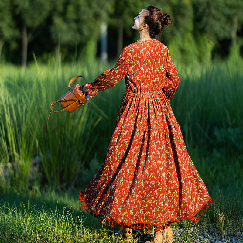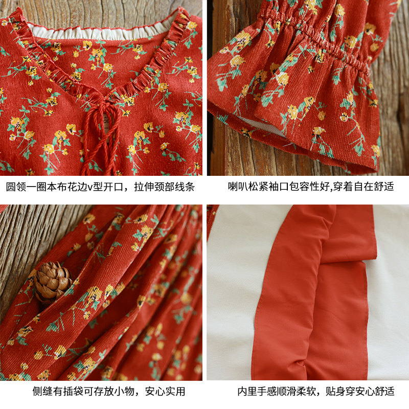 现货【红销雨霁】文艺灯芯绒印花连衣裙女秋季V领浪漫碎花大摆裙