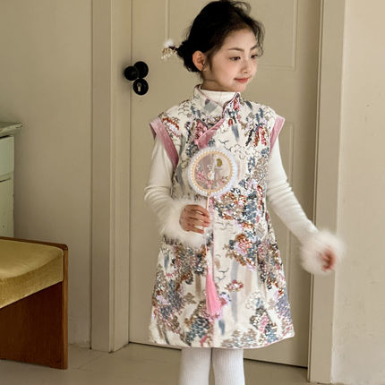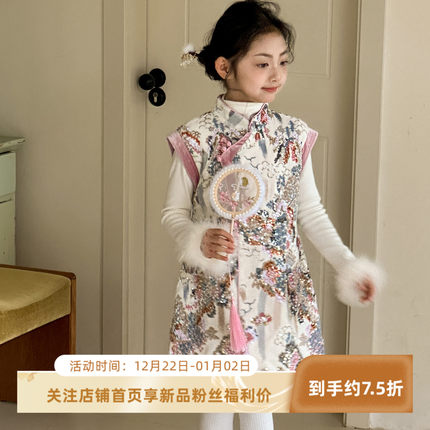 女童新年衣服背心裙2026冬季新款儿童连衣裙女大童镶钻中式旗袍裙