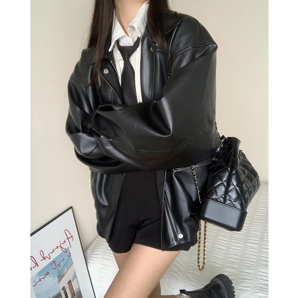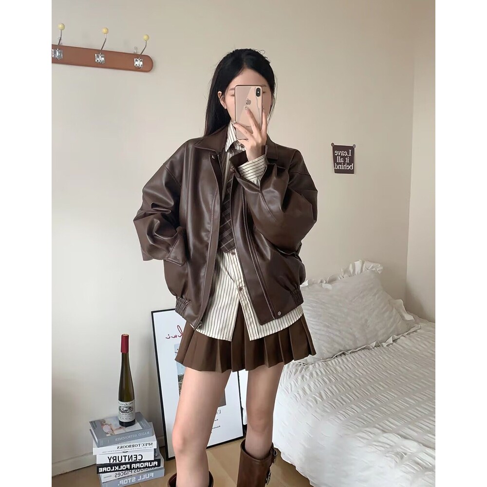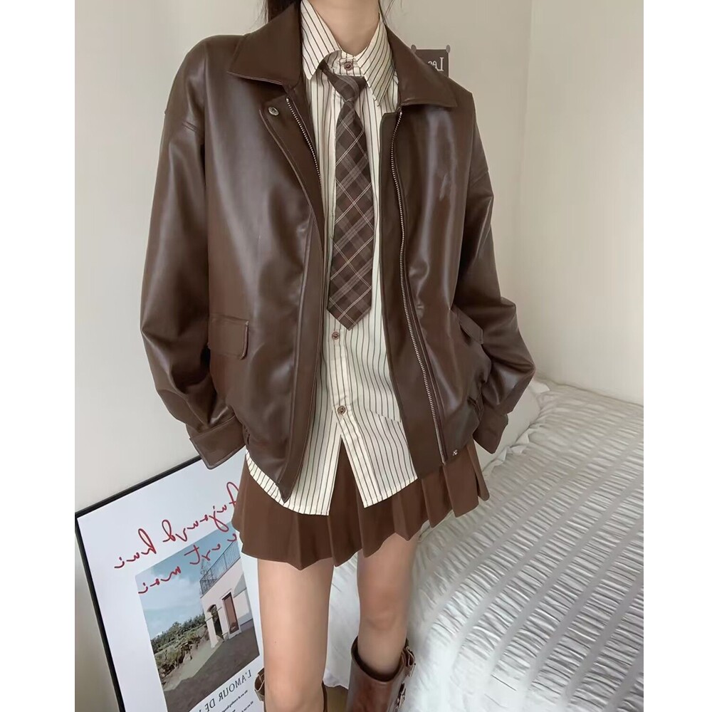 复古美式咖色皮衣夹克外套女早春秋甜酷风机车PU皮宽松长袖美拉德