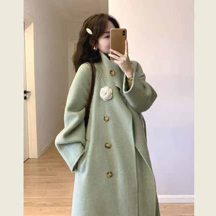 森系复古绿色立领呢子大衣女秋冬季韩版宽松阔显瘦中长款毛呢外套