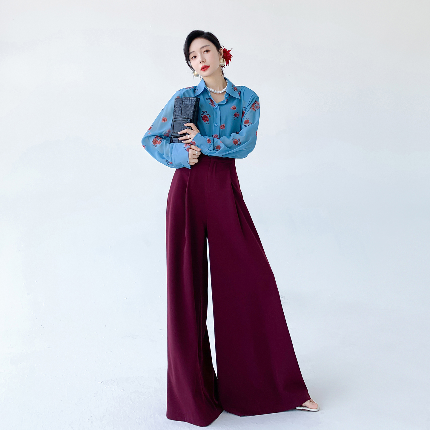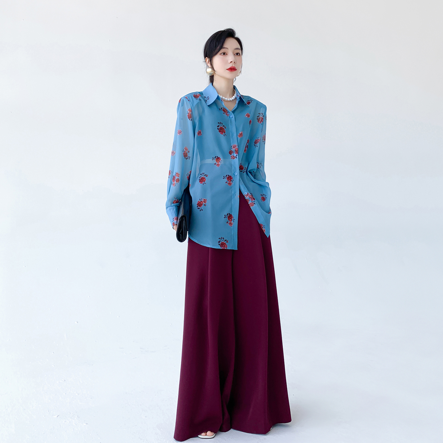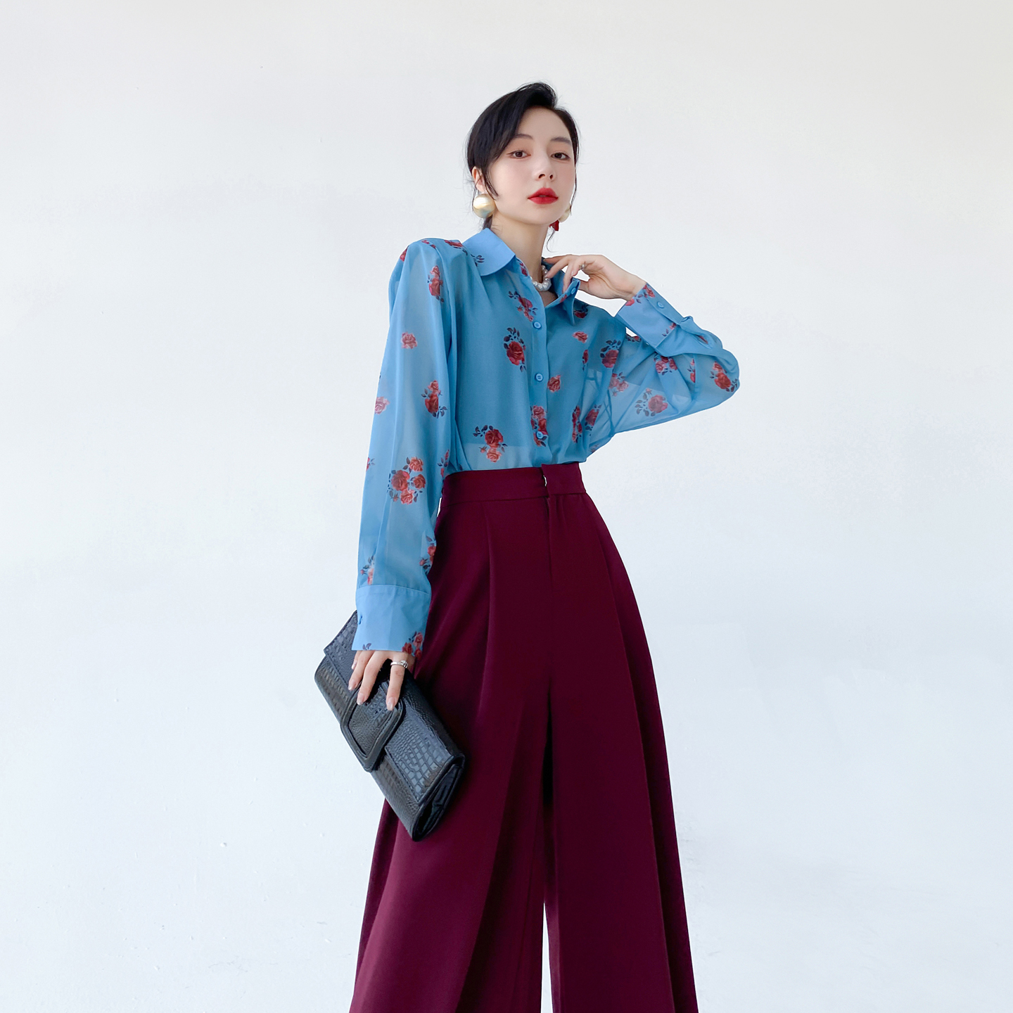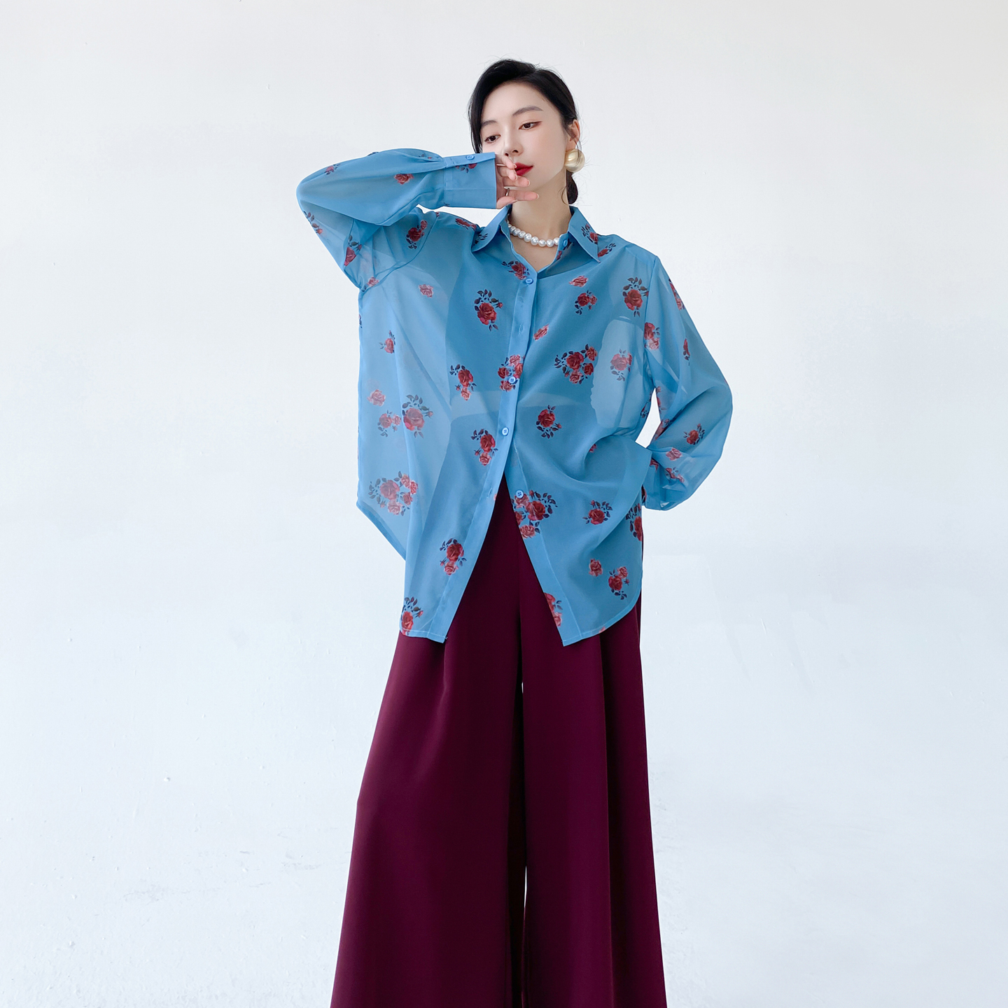 AKSAYA高级感港风复古时髦洋气印花衬衣宽松雪纺长袖衬衫女春秋