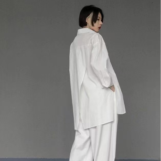 复古港味百搭宽松衬衫女春秋洋气个性设计感小众中长款不规则上衣