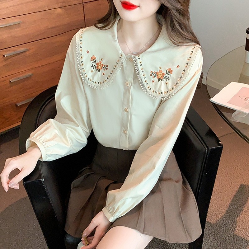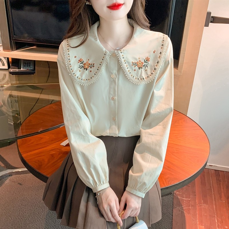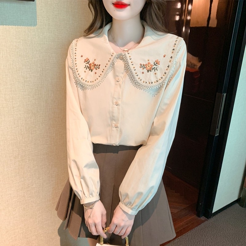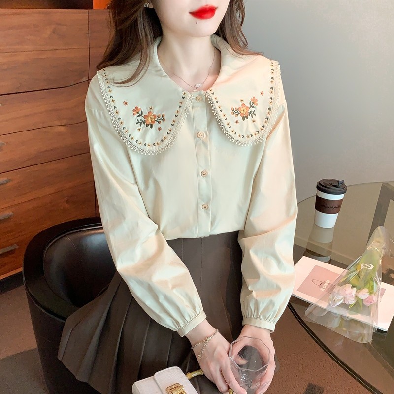 法式刺绣娃娃领衬衫女设计感小众春秋2025年新款长袖气质雪纺上衣