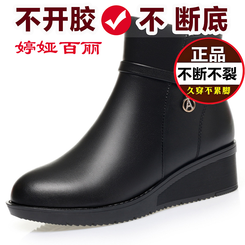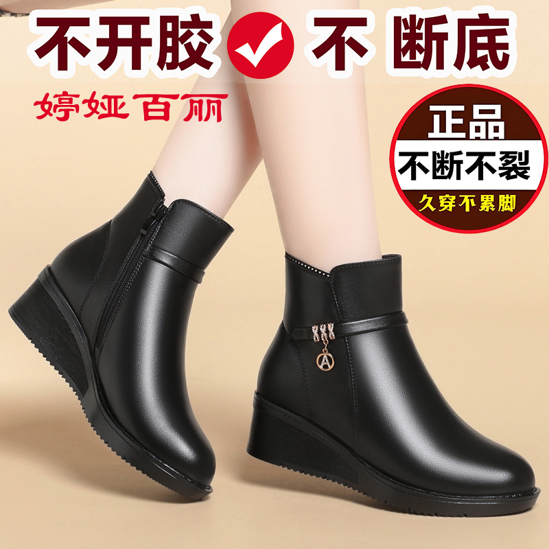 婷娅百丽2025新款中跟软皮女靴防滑坡跟加绒羊毛里妈妈皮靴女棉鞋