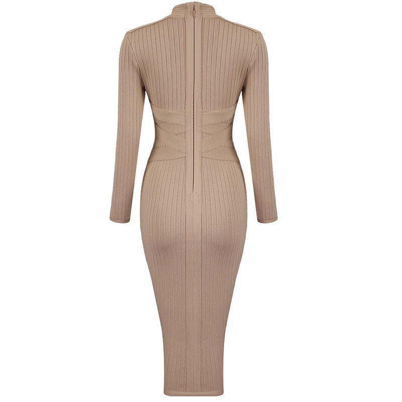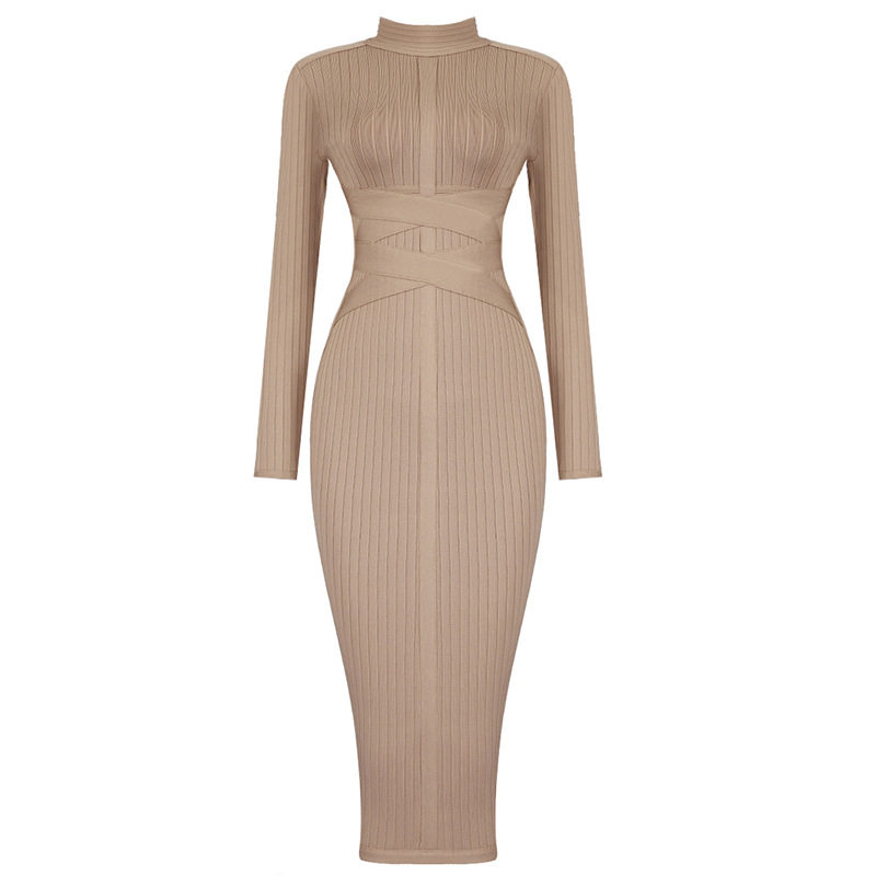 2024年新冬季卡其色长袖立领绷带连衣裙女性感包臀紧身名人晚礼服