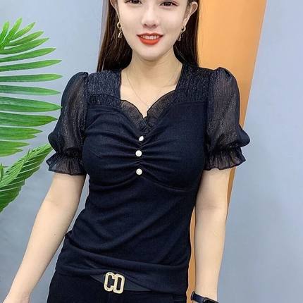 2025夏季新款V领雪纺拼接时尚百搭打底衫女修身显瘦五分袖t恤女潮