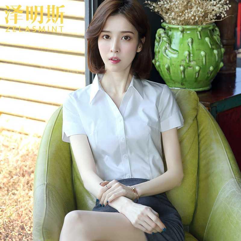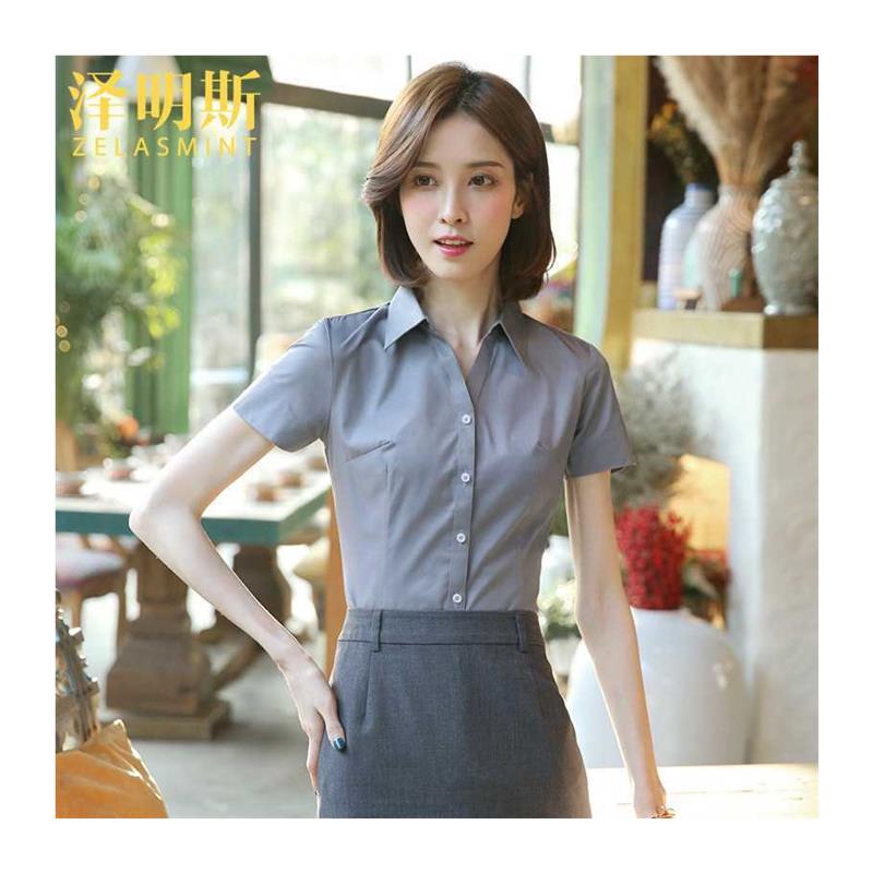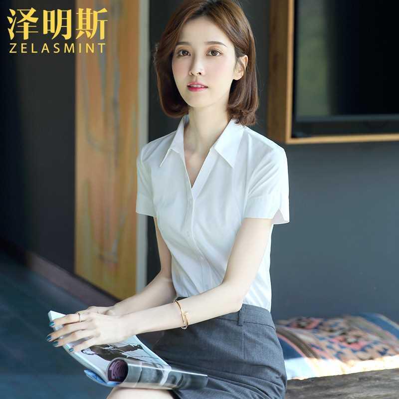 粉色V领职业短袖衬衫女正装包裙子套装夏薄2023新款工作服白衬衣