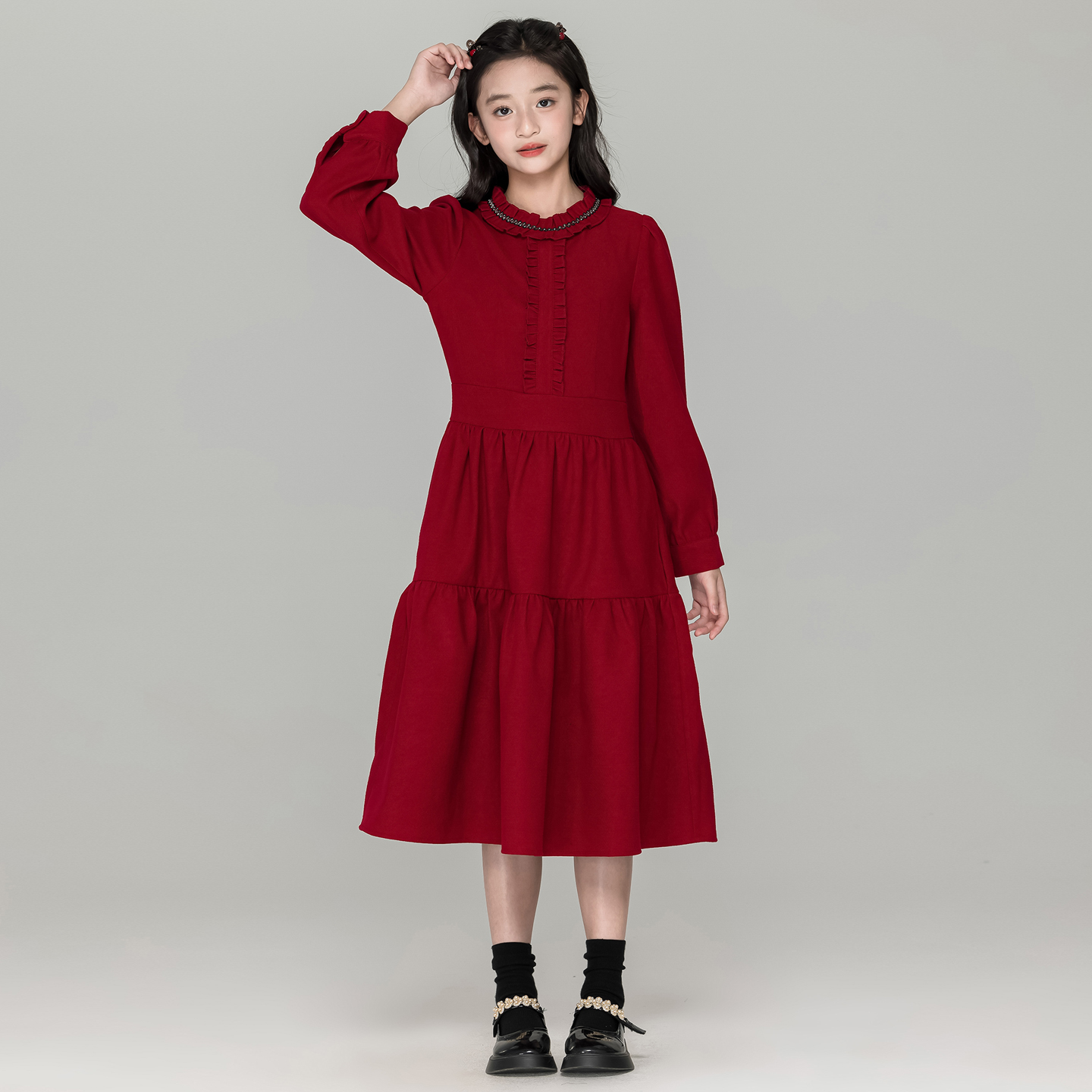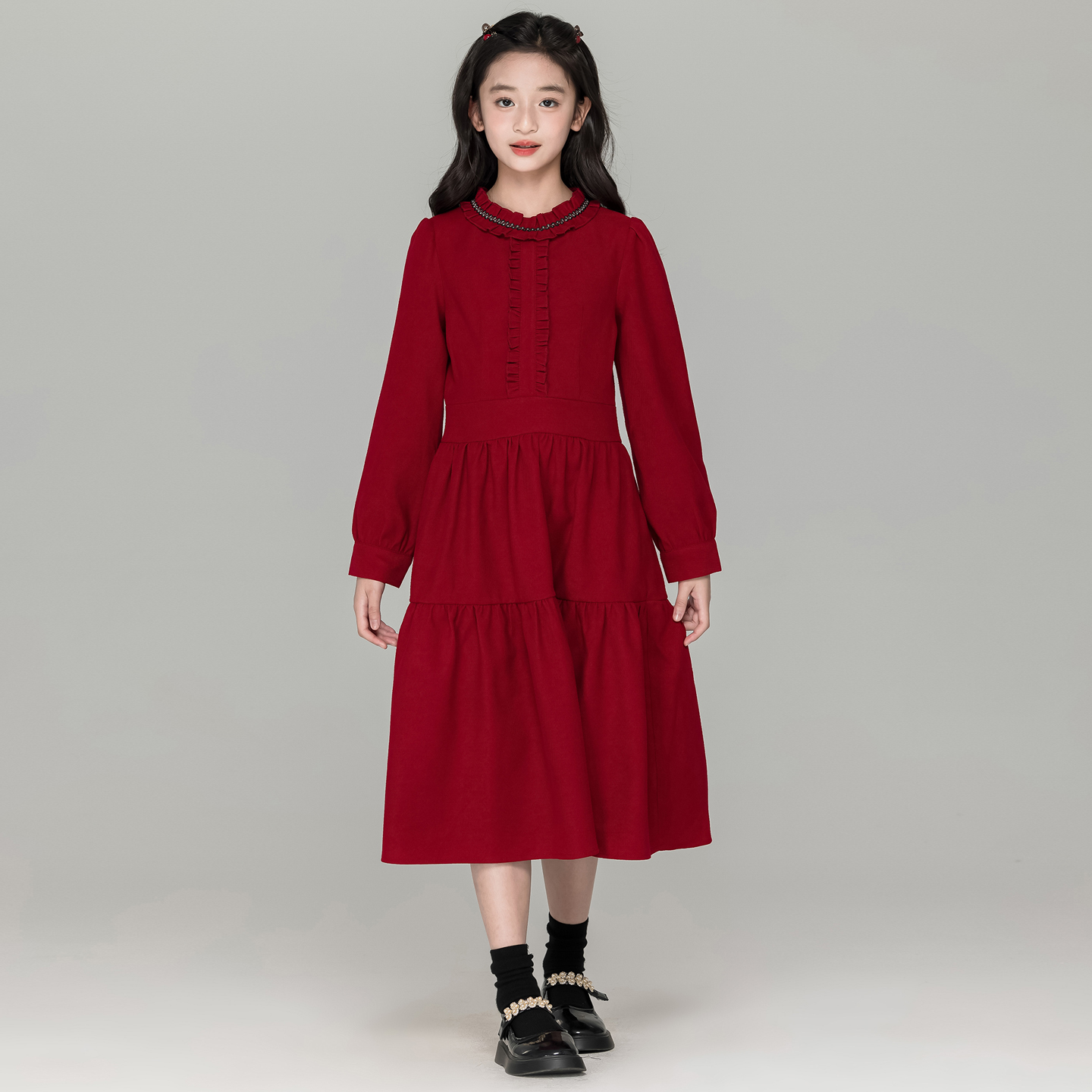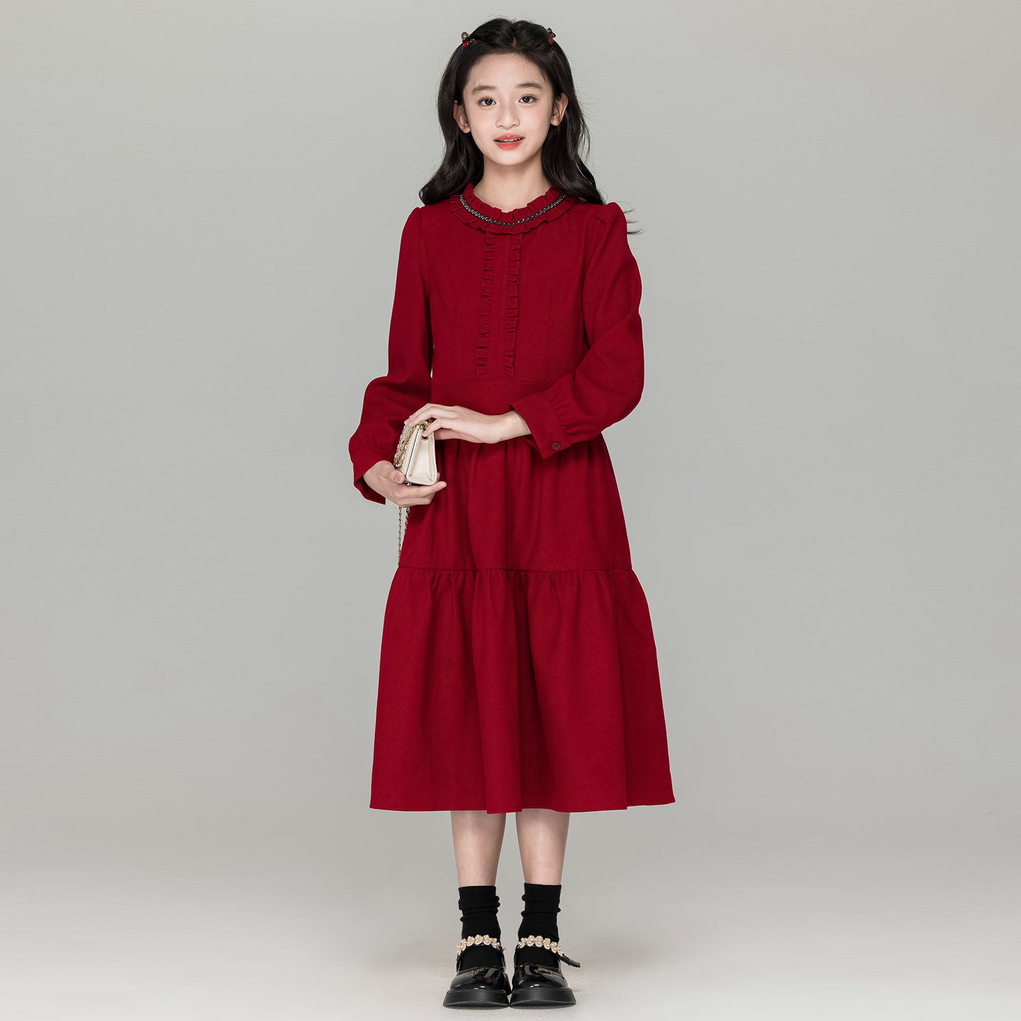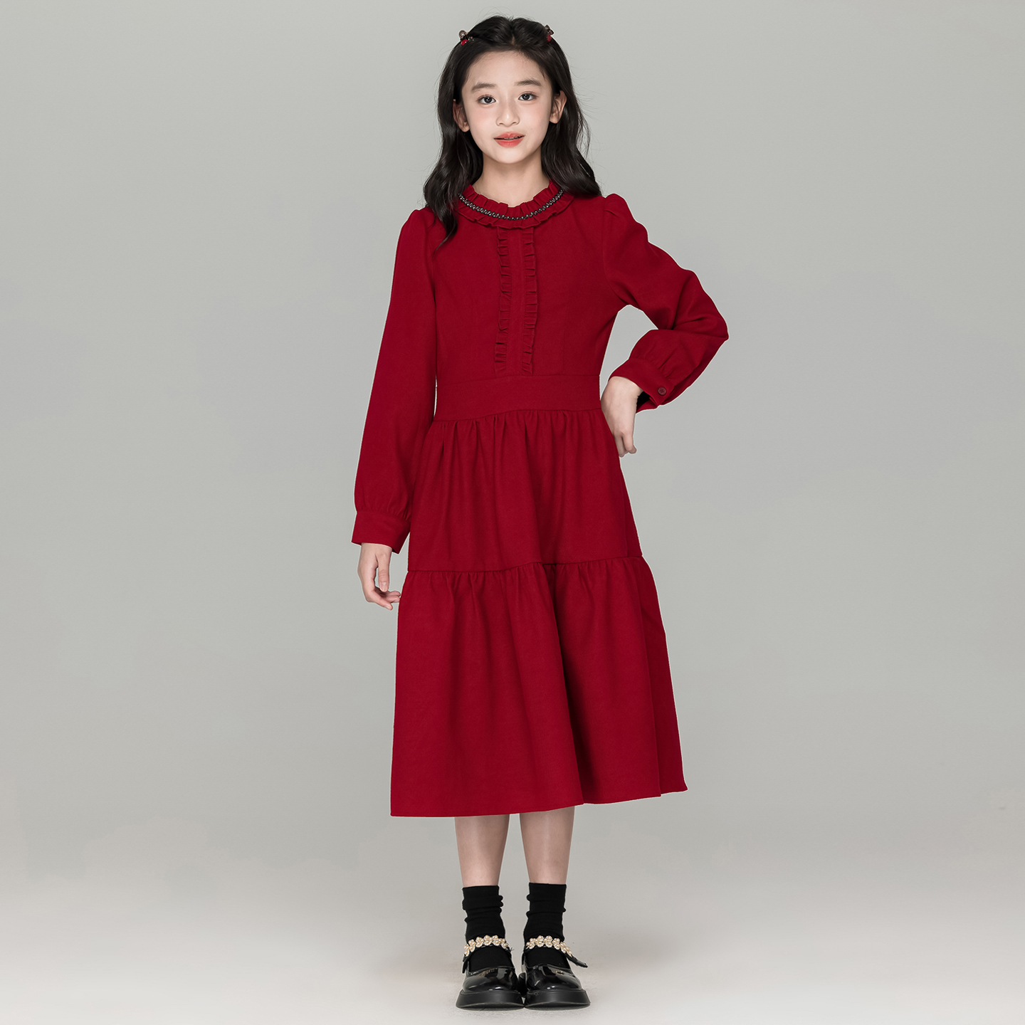 法式甜美风花边领红色连衣裙女童秋冬新款过年裙子初中生过膝长裙