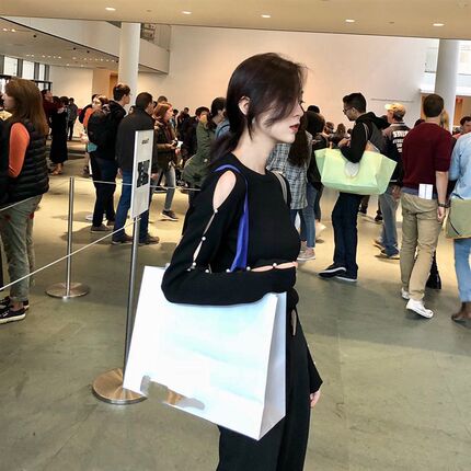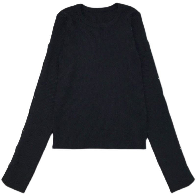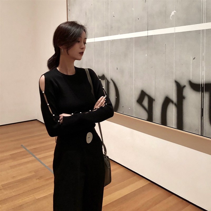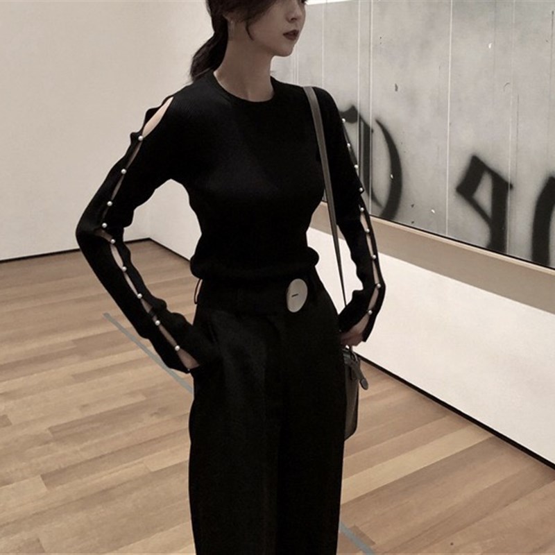 珍珠露肩针织衫T恤女春季性感紧身破洞镂空毛衣修身打底长袖上衣