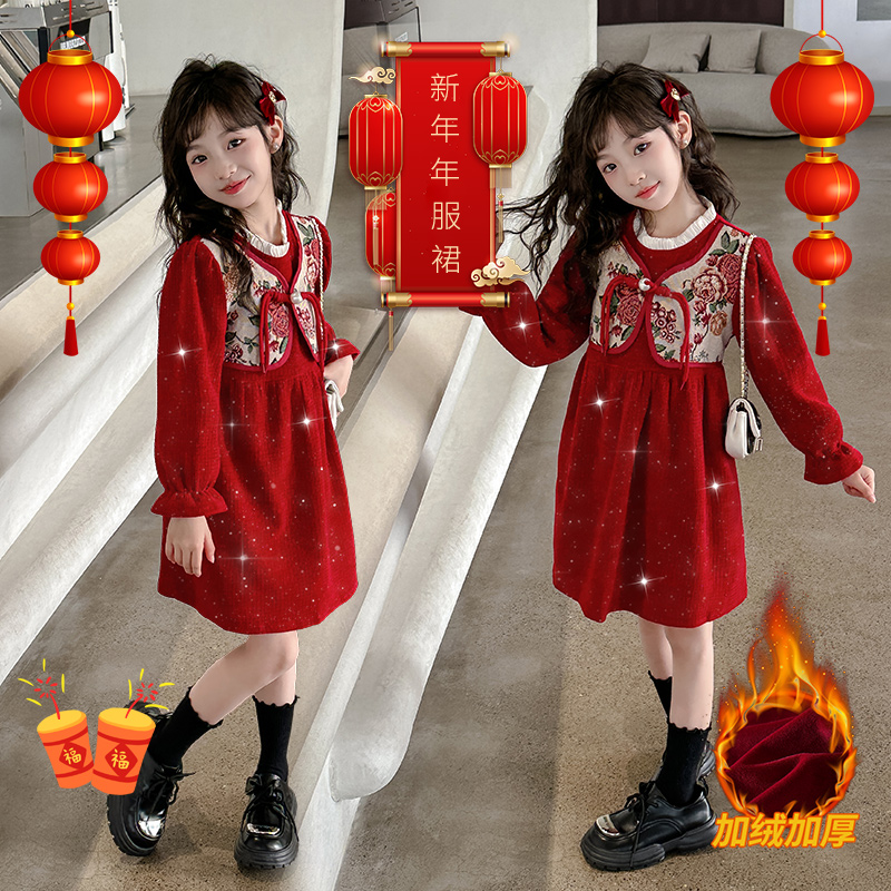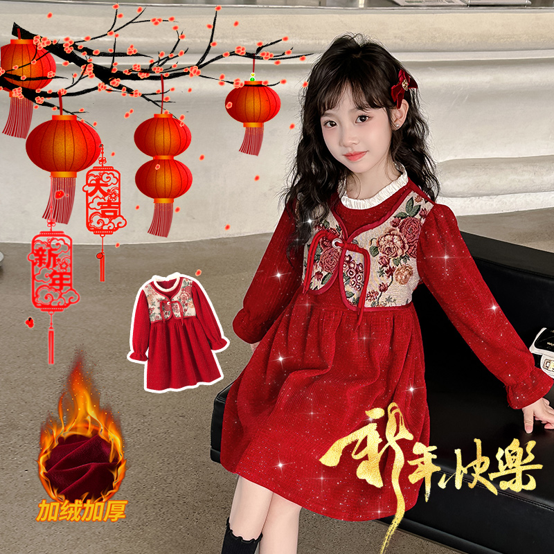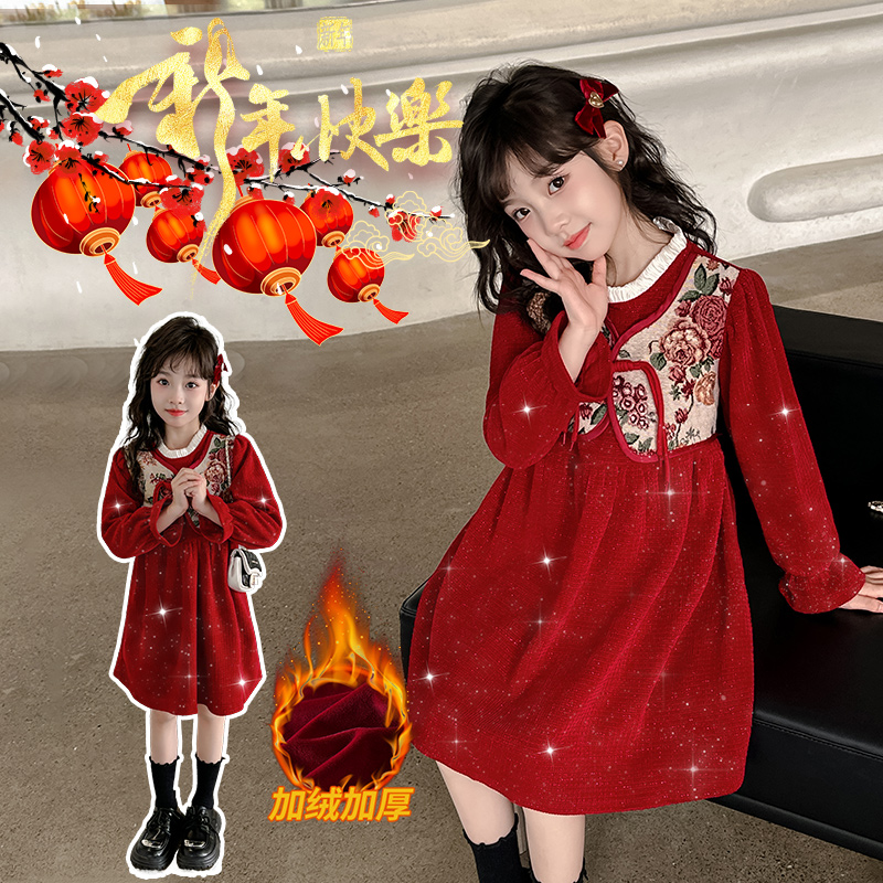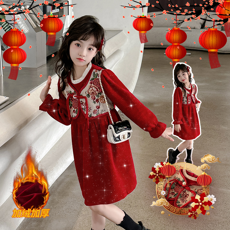 小黄鸭女童秋冬洋气连衣裙儿童2025新款中国风加绒新年红色公主裙