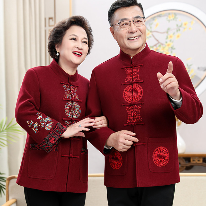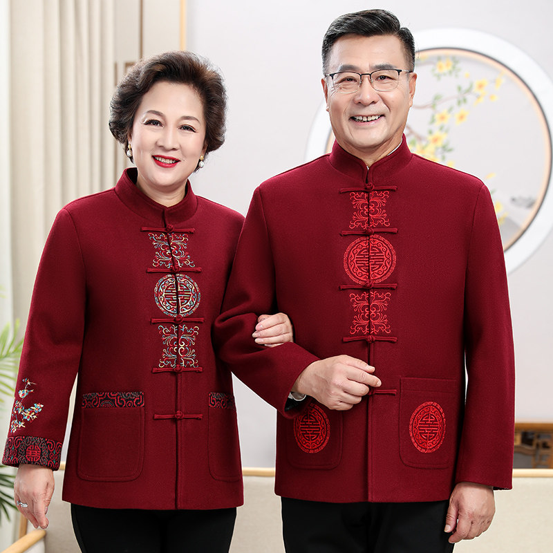 中国风秋冬羊毛呢情侣唐装男中老年加绒套装老人爷爷奶奶生日外套
