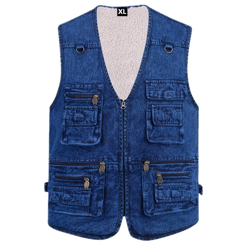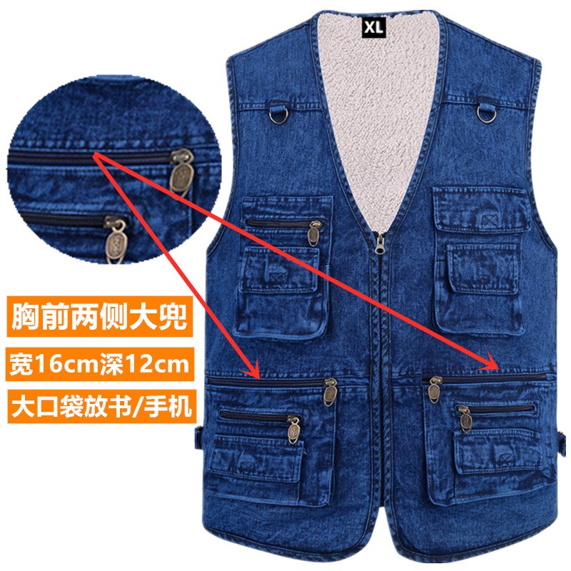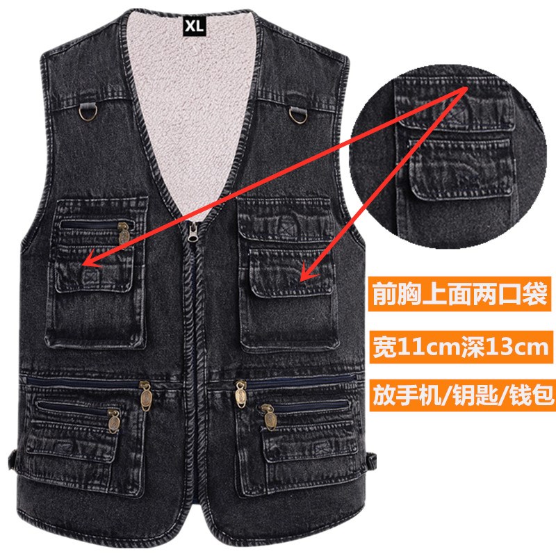 加绒加厚纯棉牛仔马甲男士秋冬棉马夹毛背心加肥加大多口袋休闲爸
